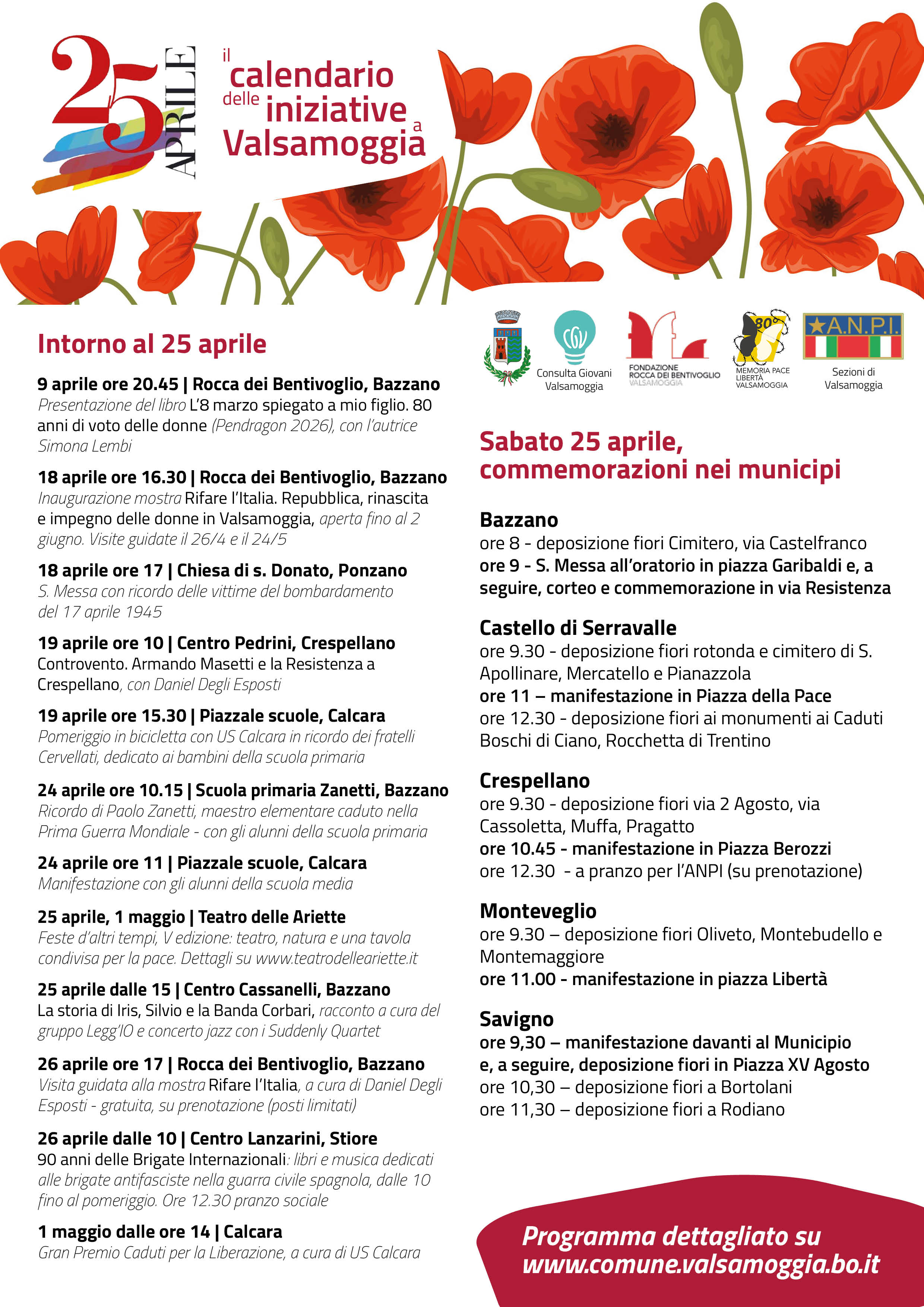Eventi 25 aprile in Valsamoggia 09 Aprile 2026 - 25 Aprile 2026 Bologna In allegato il calendario delle iniziative dal 9 al 25 aprile Allegati Locandina-programma (891.43 KB)