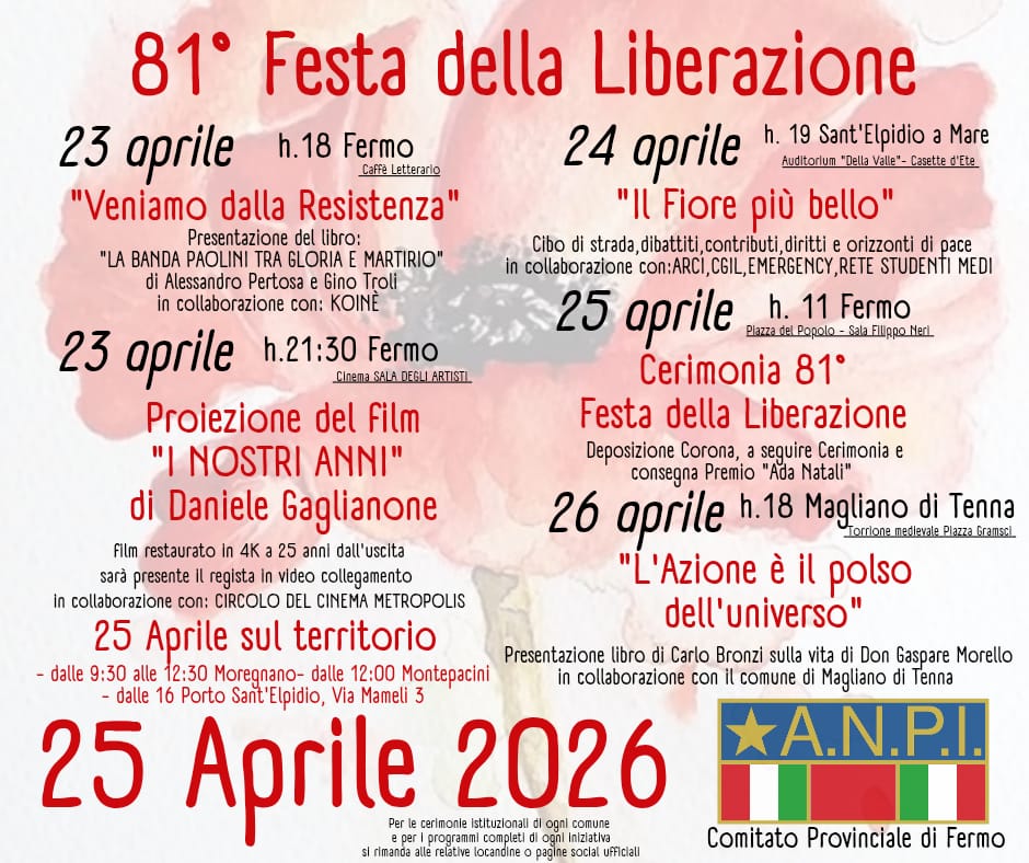 Eventi 81^ Festa della Liberazione a Fermo 23 Aprile 2026 - 26 Aprile 2026 Fermo Programma delle iniziative dal 23 al 26 aprile Allegati Locandina-programma (147.68 KB)