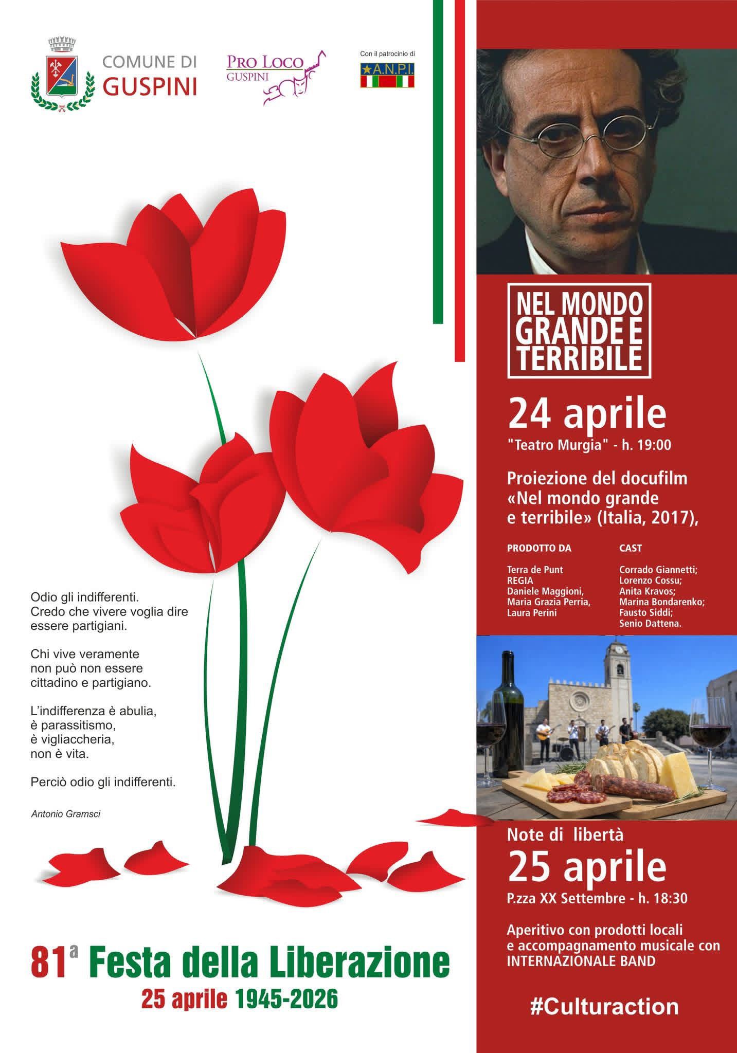 L’iniziativa di Guspini proseguirà, con Note di Libertà, sabato 25 aprile 2026, ore 18:30, in piazza XX Settembre, aperitivo con prodotti locali e accompagnamento musicale con INTERNAZIONALE BAND.
