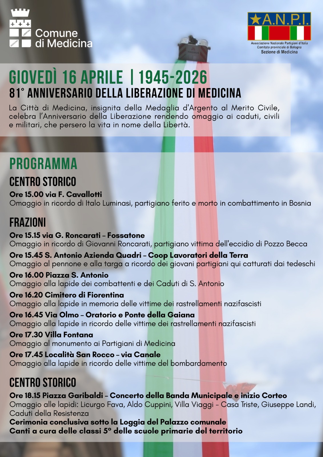 Eventi 81° anniversario della Liberazione di Medicina 16 Aprile 2026 Bologna Giovedì 16 aprile 2026 Programma dettagliato allegato Allegati Locandina (375.29 KB)