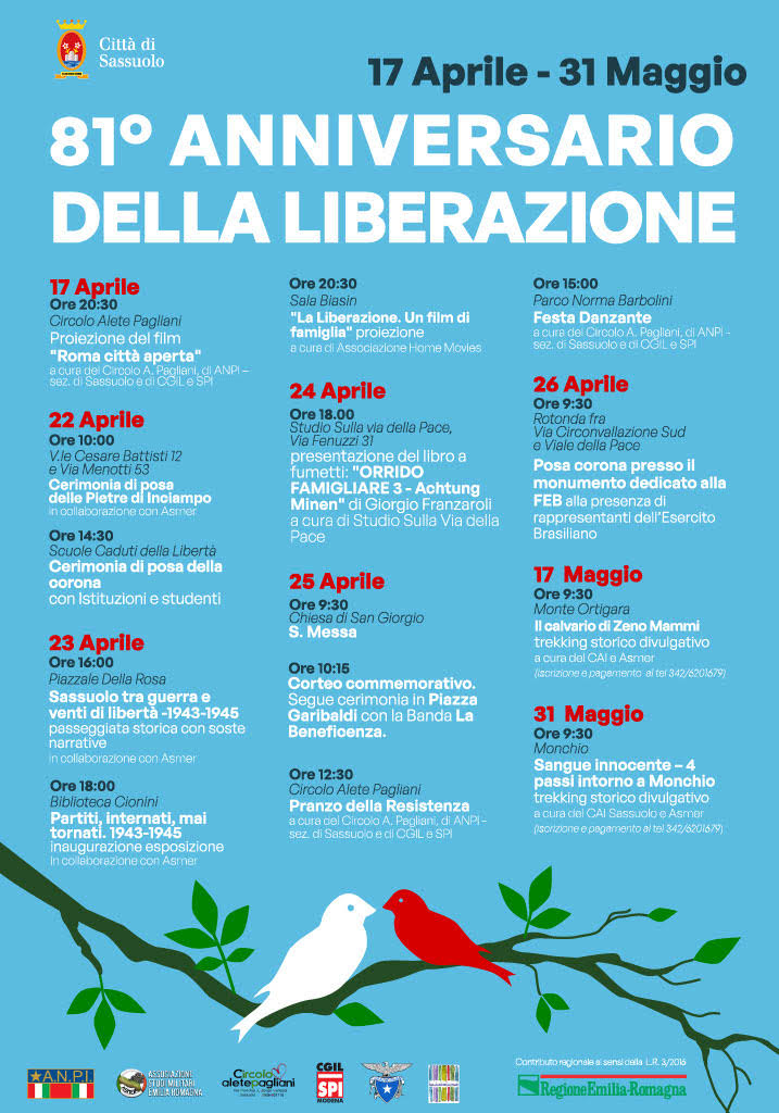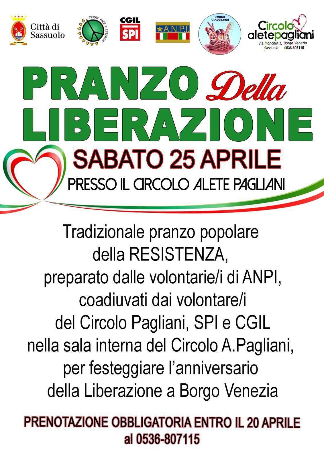 12.30 Pranzo della Resistenza al Circolo Alete Pagliani, a cura del Circolo A. Pagliani e di ANPI – sez. di Sassuolo e di CGIL e SPI