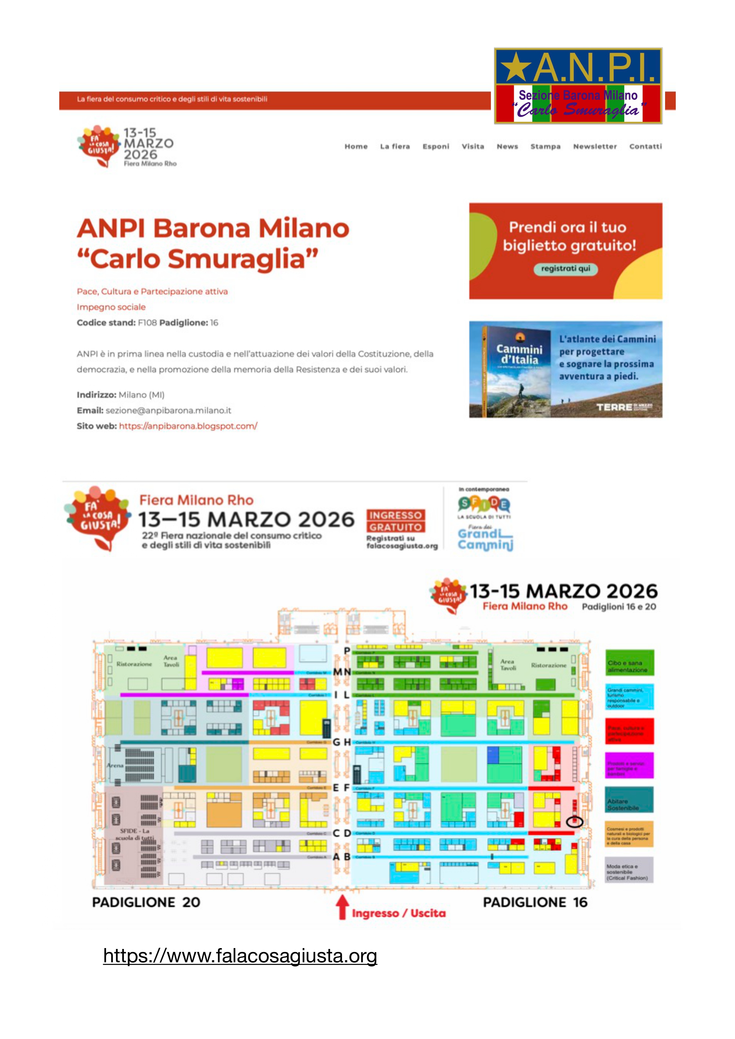 La Sezione ANPI Barona Milano “Carlo Smuraglia” sarà presente con un suo piccolo stand alla Fiera “Fa' la Cosa Giusta!” Rho (MI) 13.14.15. marzo 2026