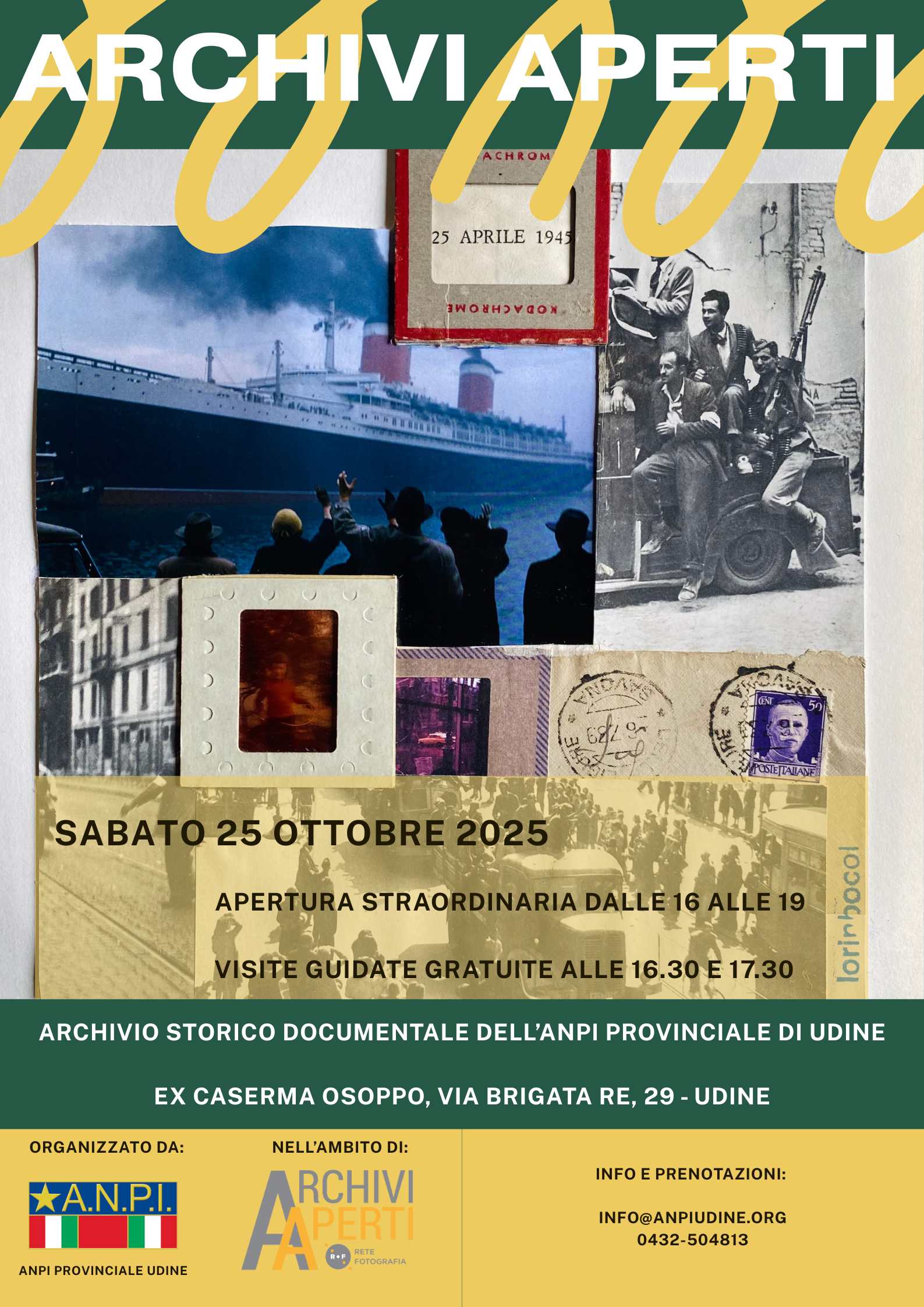Il Comitato provinciale dell'Associazione nazionale partigiani d'Italia (ANPI) di Udine apre in via straordinaria il suo archivio storico documentale. Sabato 25 ottobre, il sodalizio propone due visite guidate gratuite e aderisce così, per la prima volta, ad Archivi Aperti, la rassegna nazionale indetta da Rete Fotografia che per la sua undicesima edizione ha scelto di focalizzarsi sul tema della "Fotografia resistente: il ruolo delle immagini nella narrazione storica". Sarà questa un'occasione unica per tutti coloro che vorranno scoprire volti, vicende umane e scenari inediti risalenti al periodo della Seconda Guerra Mondiale e della Lotta di Liberazione in Friuli Venezia Giulia. A condurre il pubblico tra le sezioni di un autentico scrigno di immagini e memoria saranno Stefano Perulli, curatore del progetto di riordino dell'archivio fotografico dell'ANPI udinese, insieme a Diego Compagnoni, referente dell'archivio. L'iniziativa permetterà di compiere un viaggio originale nei valori della democrazia alla base della Costituzione della Repubblica Italiana.