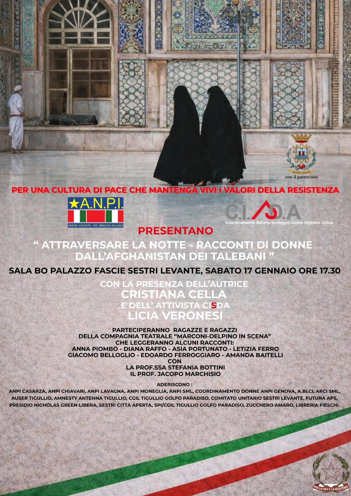ANPI Sestri Levante e CISDA (Coordinamento Italiano Sostegno Donne Afghane Onlus) presentano il libro ATTRAVERSARE LA NOTTE - RACCONTI DI DONNE DALL'AFGHANISTAN DEI TALEBANI"