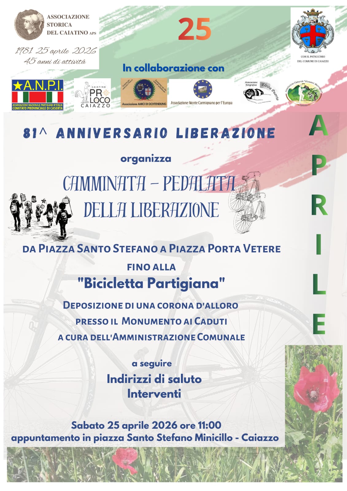 nel 25° anniversario della sua Fondazione, l’Associazione Storica del Caiatino, insieme al Comitato Provinciale dell’ANPI, alla Pro Loco Caiatina, all’Associazione Monte Carmignano per l’Europa, all’Associazione Amici di Ochtendung ed altri, animeranno la CAMMINATA-PEDALATA DELLA LIBERAZIONE da Piazza Santo Stefano a Piazza Porta Vetere fino alla Bicicletta Partigiana.