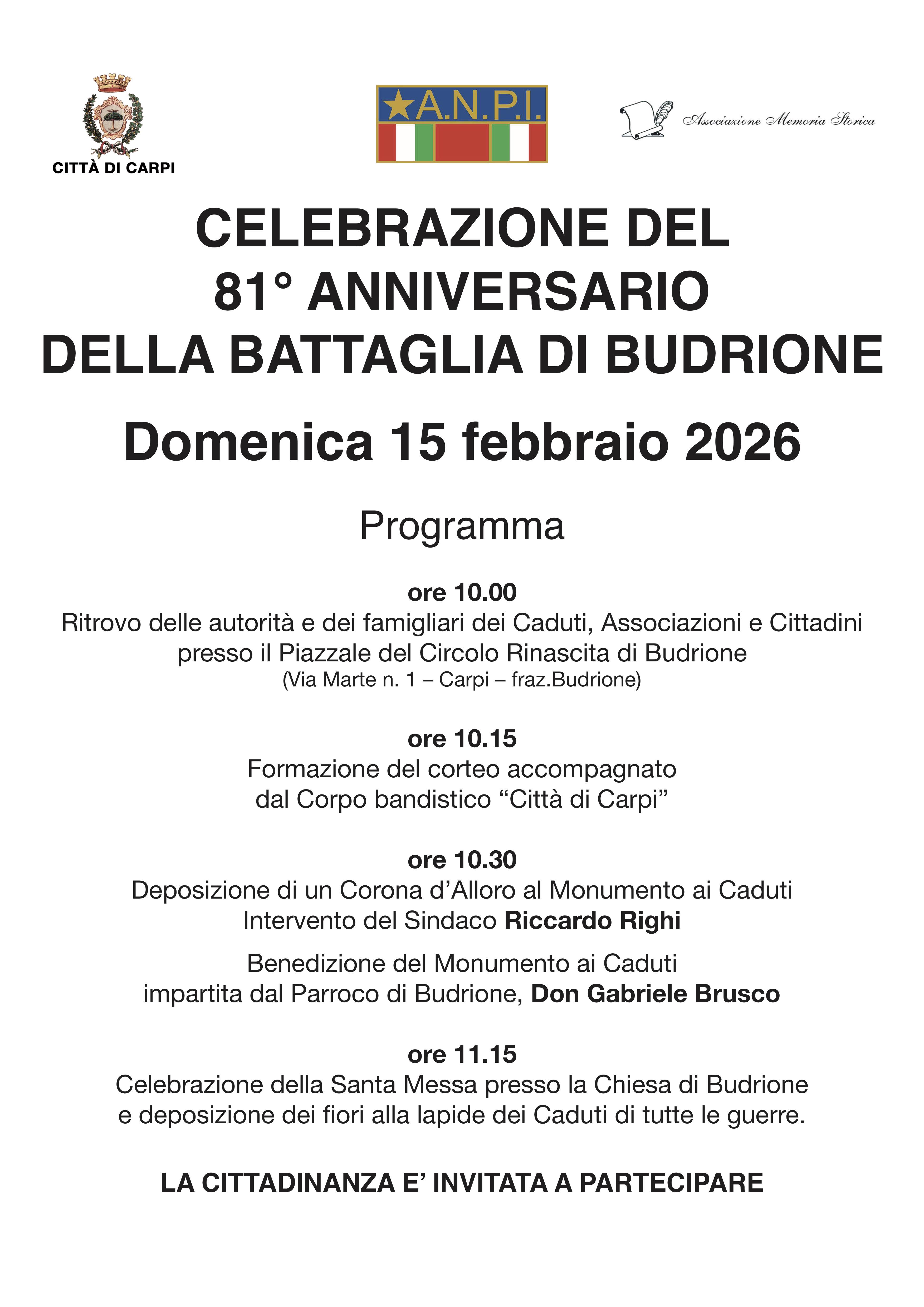 ore 10.00 - Ritrovo delle autorità e dei famigliari dei Caduti, Associazioni e Cittadini presso il Piazzale del Circolo Rinascita di Budrione (Via Marte n. 1 - Carpi - fraz.Budrione)