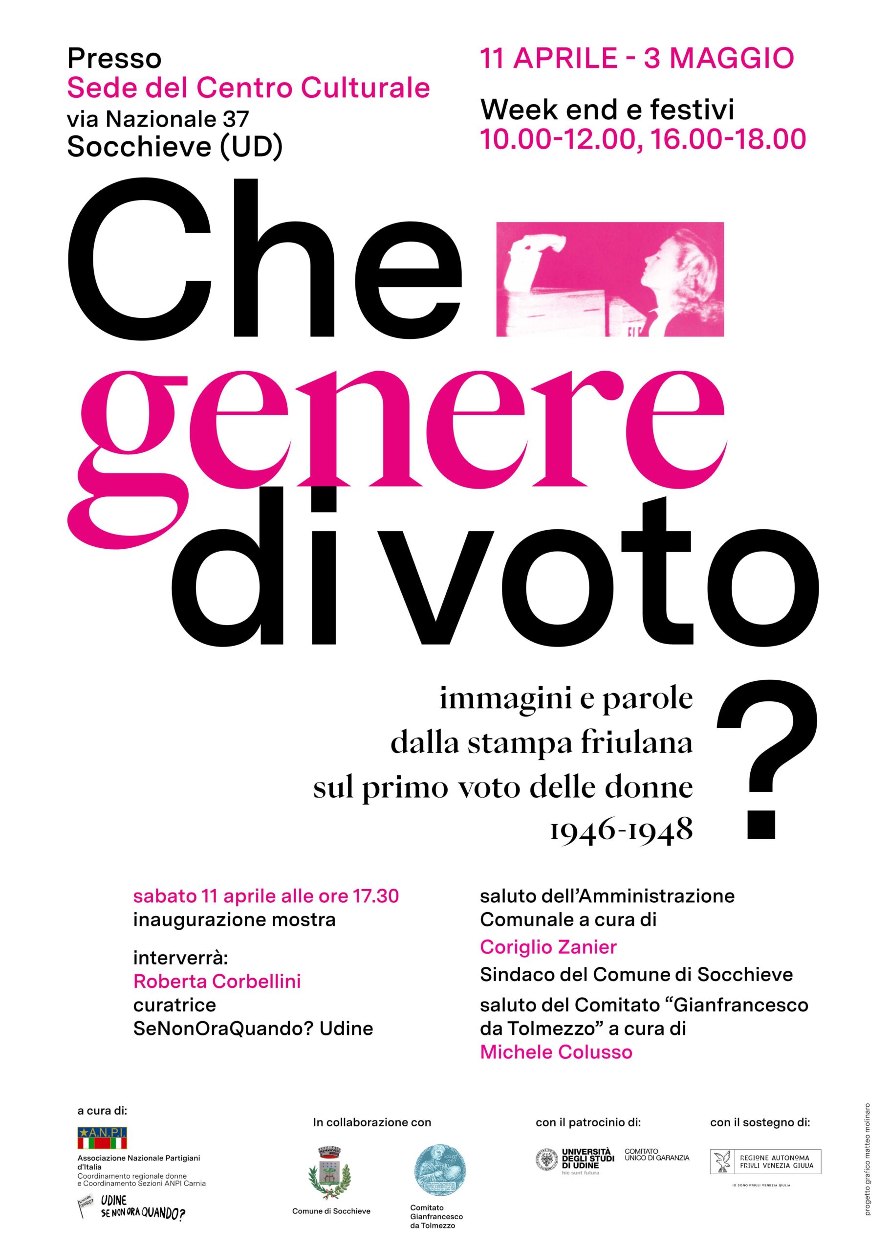 In occasione dell’ottantesimo anniversario del suffragio universale e della prima partecipazione al voto delle donne italiane nel 1946 l’esposizione sara’ riproposta a Socchieve presso la Sede del Centro Culturale e del Comitato “Gianfrancesco da Tolmezzo” in via Nazionale n.37 ed inaugurata sabato 11 aprile dalle 17.30.