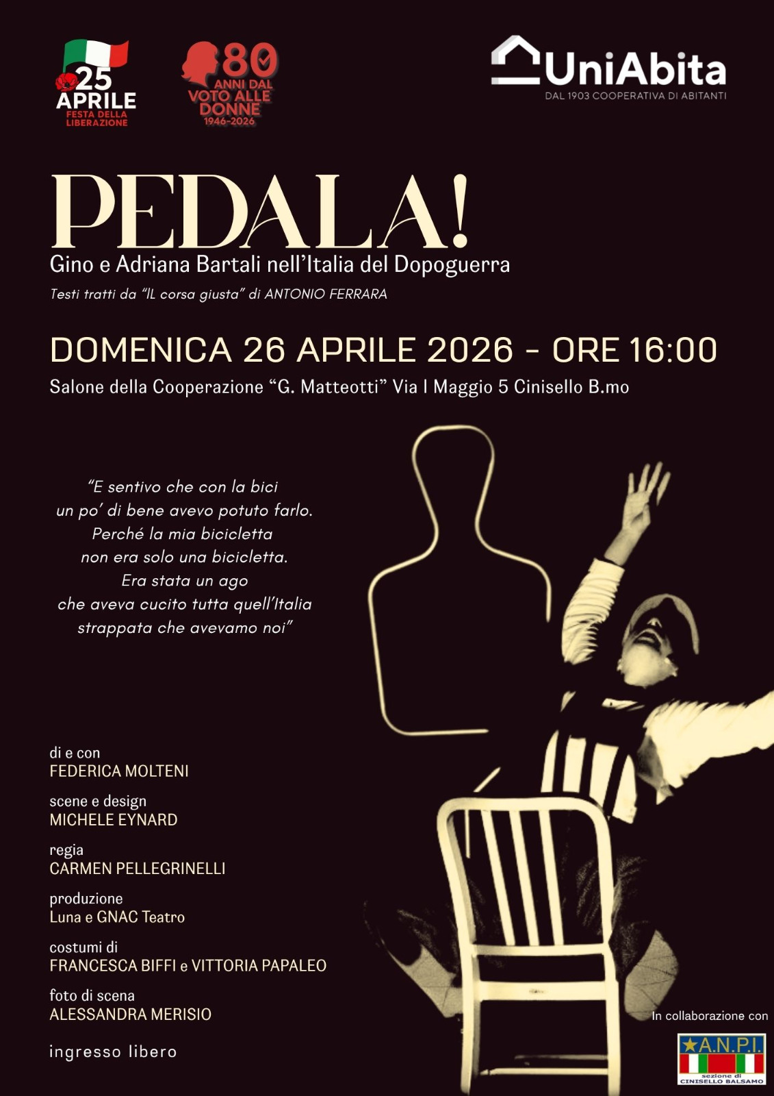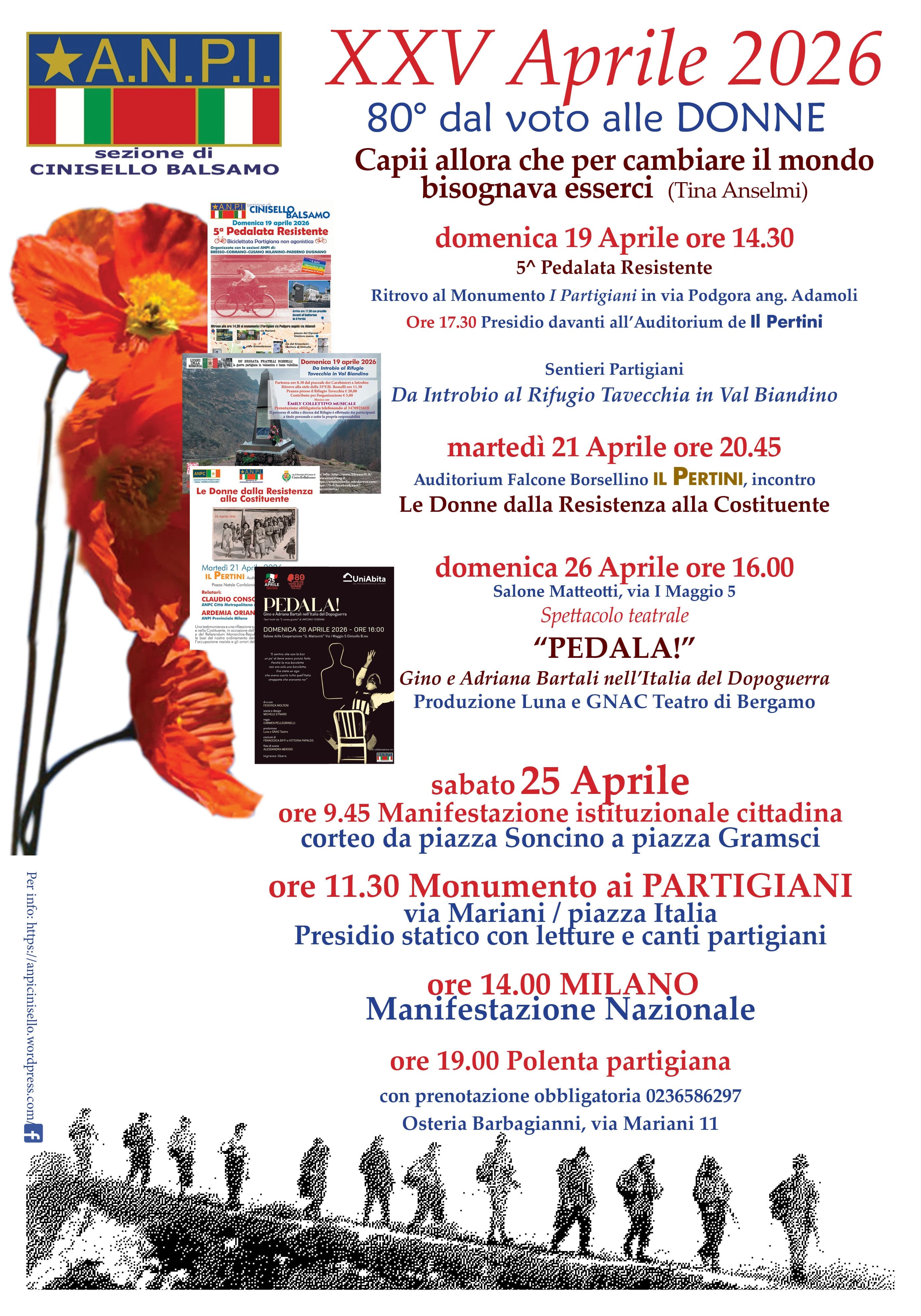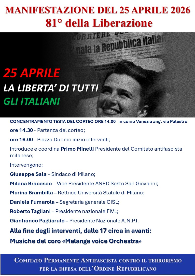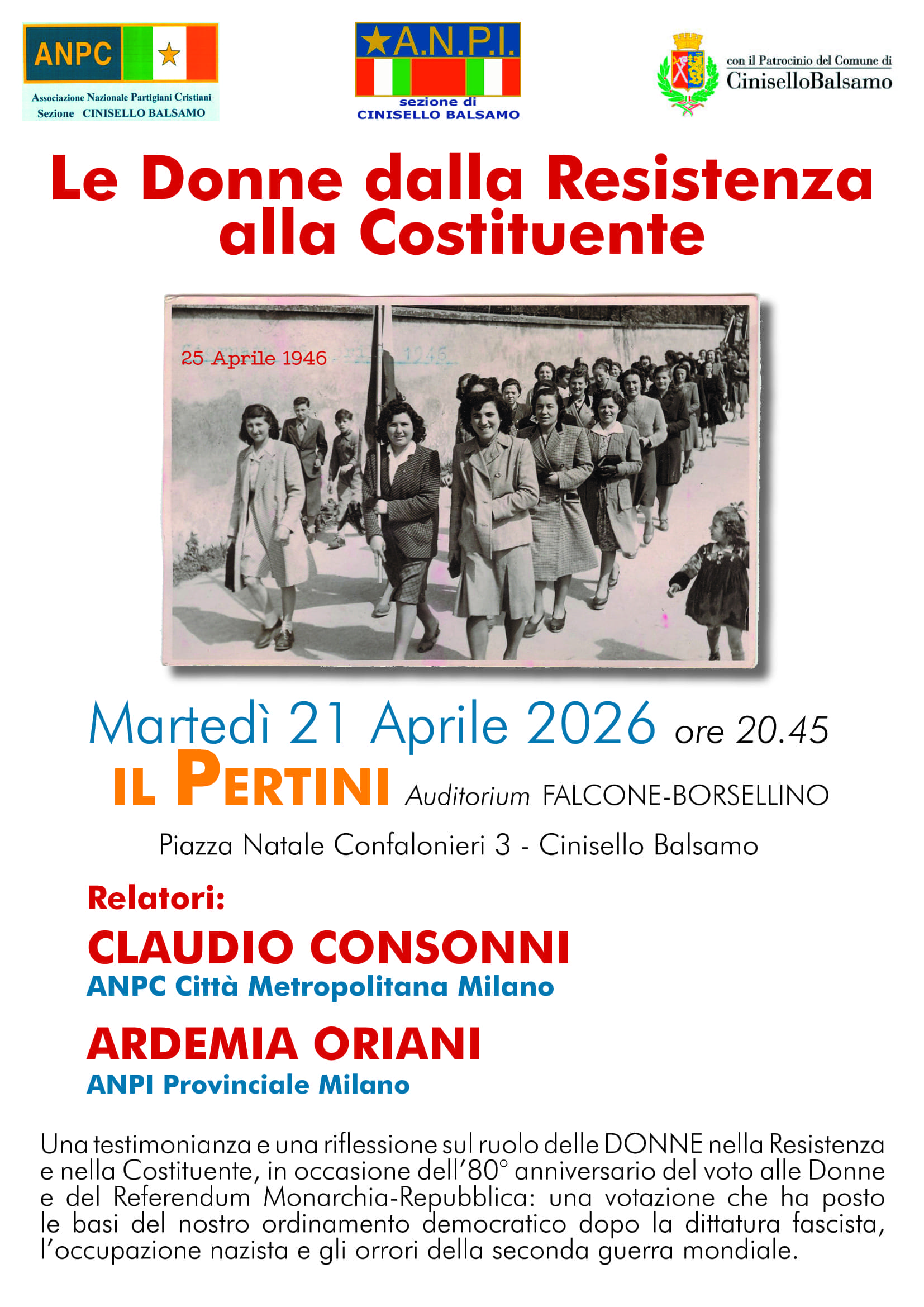 A queste donne, diventate finalmente “cittadine” con il riconoscimento del diritto di voto che troverà la sua piena espressione nel referendum istituzionale del 2 giugno 1946 e nell’elezione dell’Assemblea costituente, l’ANPI ha deciso di dedicare le celebrazioni del XXV Aprile e la sezione ANPI di Cinisello Balsamo ha organizzato una serie di iniziative in collaborazione con altre realtà del territorio che sono concentrate nei giorni che accompagnano la Festa della Liberazione e che proseguiranno poi in altri eventi in corrispondenza della festa della Repubblica.
