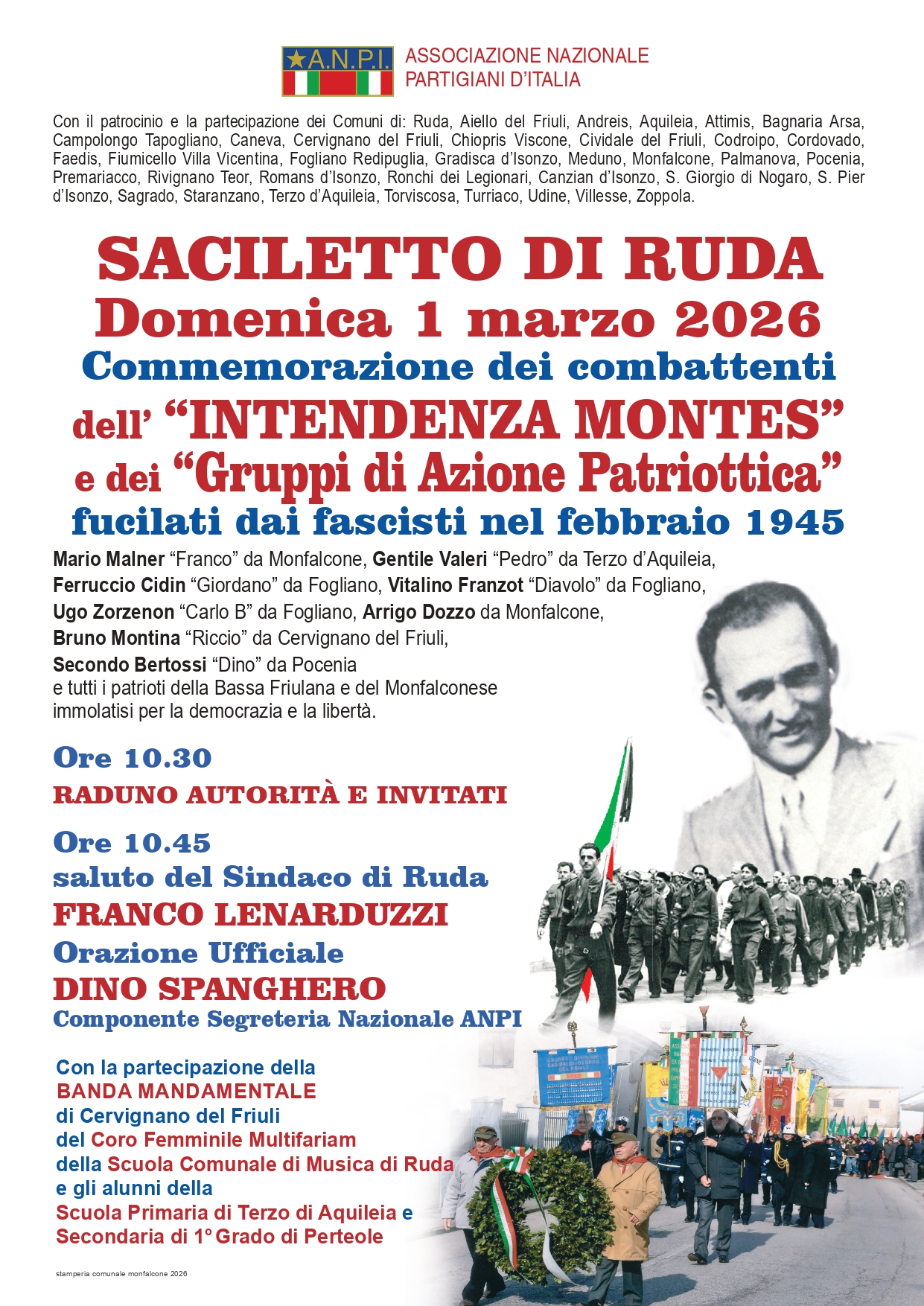 ore 10.45: presso piazza La Spessa, saluto del Sindaco di Ruda arch. Franco Lenarduzzi e orazione ufficiale del cav. Bernardino Spanghero, componente Segreteria Nazionale ANPI.