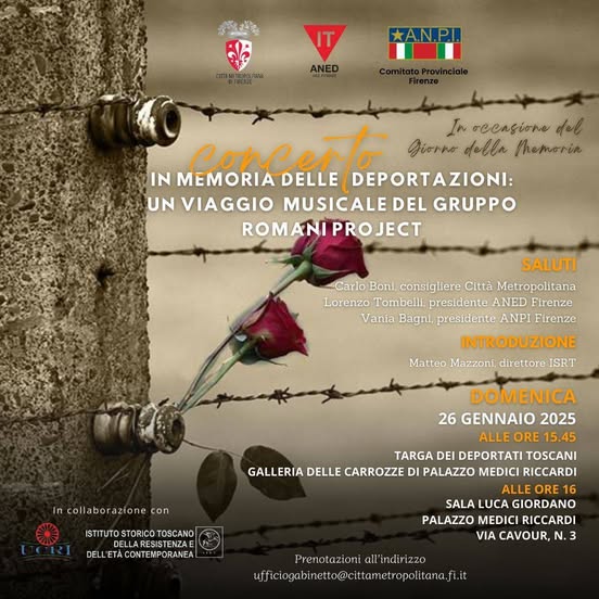 In occasione del Giorno della Memoria, la Città Metropolitana di Firenze, in collaborazione con ANED Firenze, ANPI Firenze e l’Istituto Storico Toscano della Resistenza e dell’Età Contemporanea (ISRT), è lieta di presentare il concerto “In Memoria delle Deportazioni: un viaggio musicale del gruppo Romani Project”.