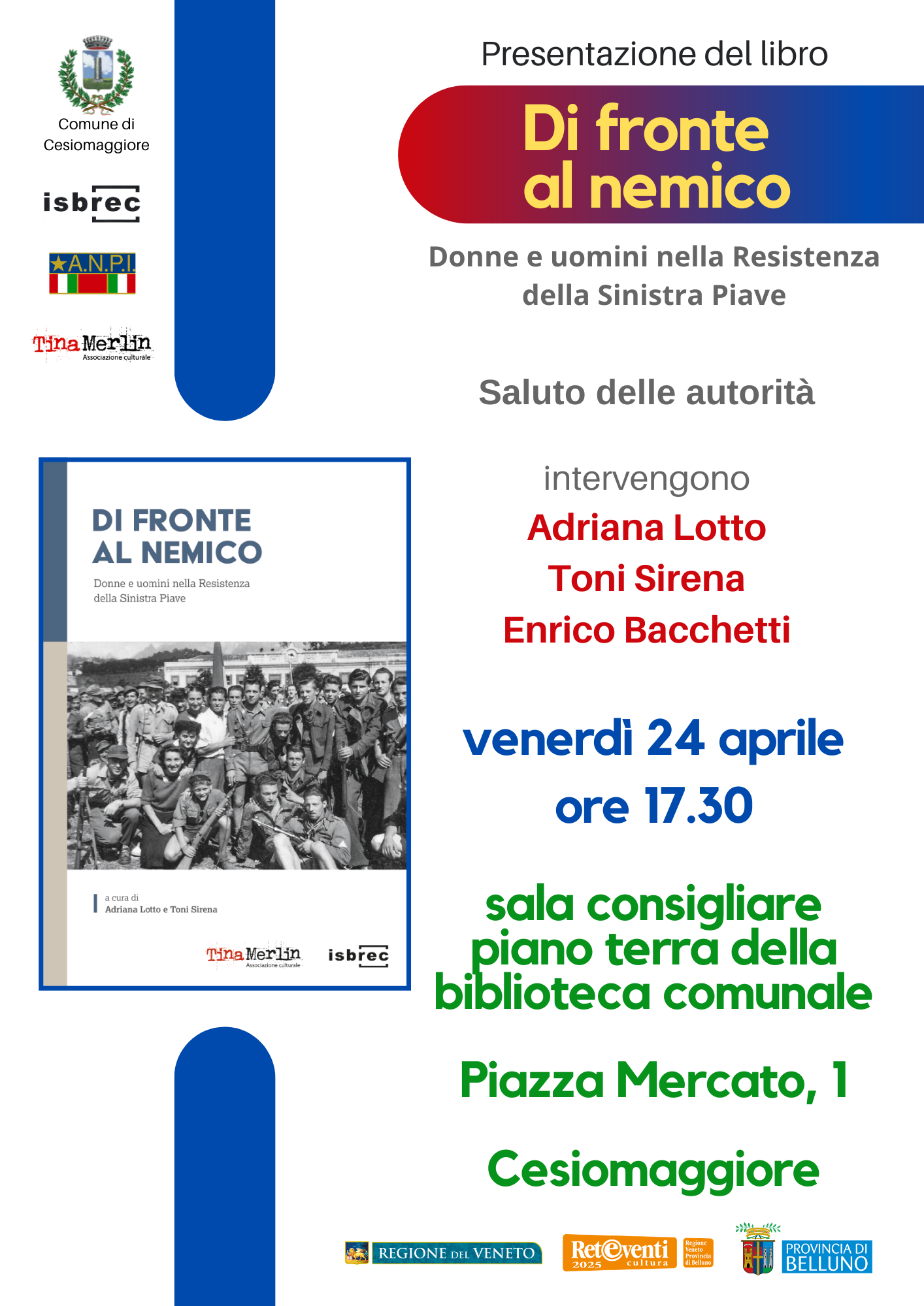 Venerdì 24 aprile, alle ore 17.30, a Cesiomaggiore presso la sala consiliare al piano terra della biblioteca comunale, si terrà la presentazione del volume “Di fronte al nemico. Donne e uomini nella Resistenza della Sinistra Piave“, curato da Adriana Lotto e Toni Sirena (Isbrec-Ass. culturale Tina Merlin, 2025). Promosso da Isbrec, Comune di Cesiomaggiore e Anpi, dopo i saluti dell’Amministrazione, vedrà la partecipazione di Adriana Lotto, Toni Sirena e Enrico Bacchetti.