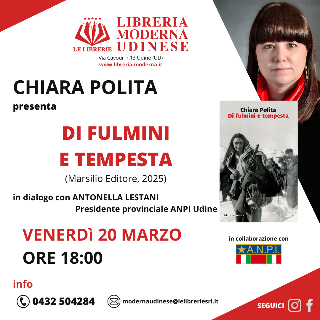 Per gli incontri letterari alla Libreria Moderna, venerdì 20 marzo, alle 18.00, la scrittrice Chiara Polita presenterà il suo romanzo "Di fulmini e tempesta" (Marsilio, 2025). L'autrice in dialogo con Antonella Lestani, presidente provinciale dell'ANPI di Udine, racconterà la Resistenza attraverso la vicenda di una donna, che da un'esistenza defilata e segnata dalla fatica quotidiana sarà capace di uscire dall'anonimato e conquistare la propria emancipazione compiendo la scelta inaspettata di trasformarsi in una partigiana. L'appuntamento nella libreria di via Cavour è organizzato in collaborazione con l'ANPI di Udine ed è con ingresso libero. Per informazioni e prenotazioni: tel. 0432504284; e.mail modernaudinese@lelibreriesrl.it.