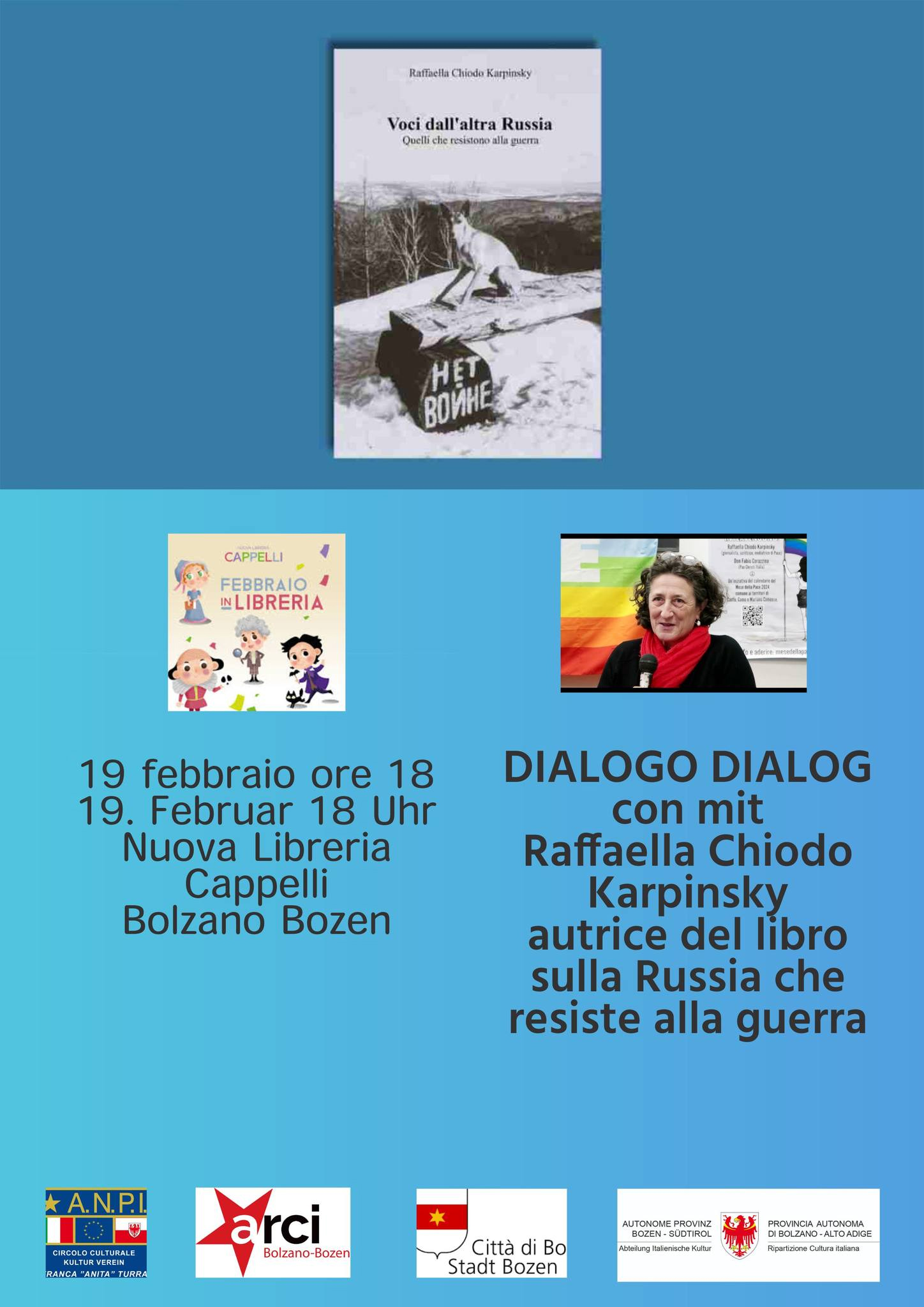 Promosso da Circolo Culturale ANPI Franca "Anita" Turra Hans Egarter e Nuova Libreria Cappelli in collaborazione con ARCI Bolzano Bozen, con il sostegno degli Assessorati alla Cultura di Provincia e Comune di Bolzano