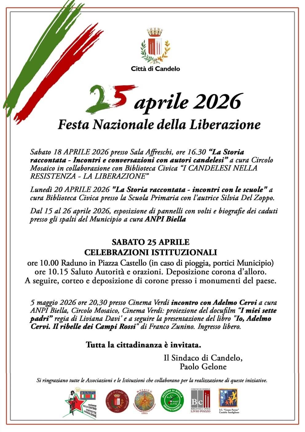 SABATO 18 APRILE 2026 presso Sala Affreschi, ore 16.30 "La Storia raccontata - Incontri e conversazioni con autori candelesi", a cura Circolo Mosaico in collaborazione con Biblioteca Civica "I Candelesi nella Resistenza - La Liberazione"