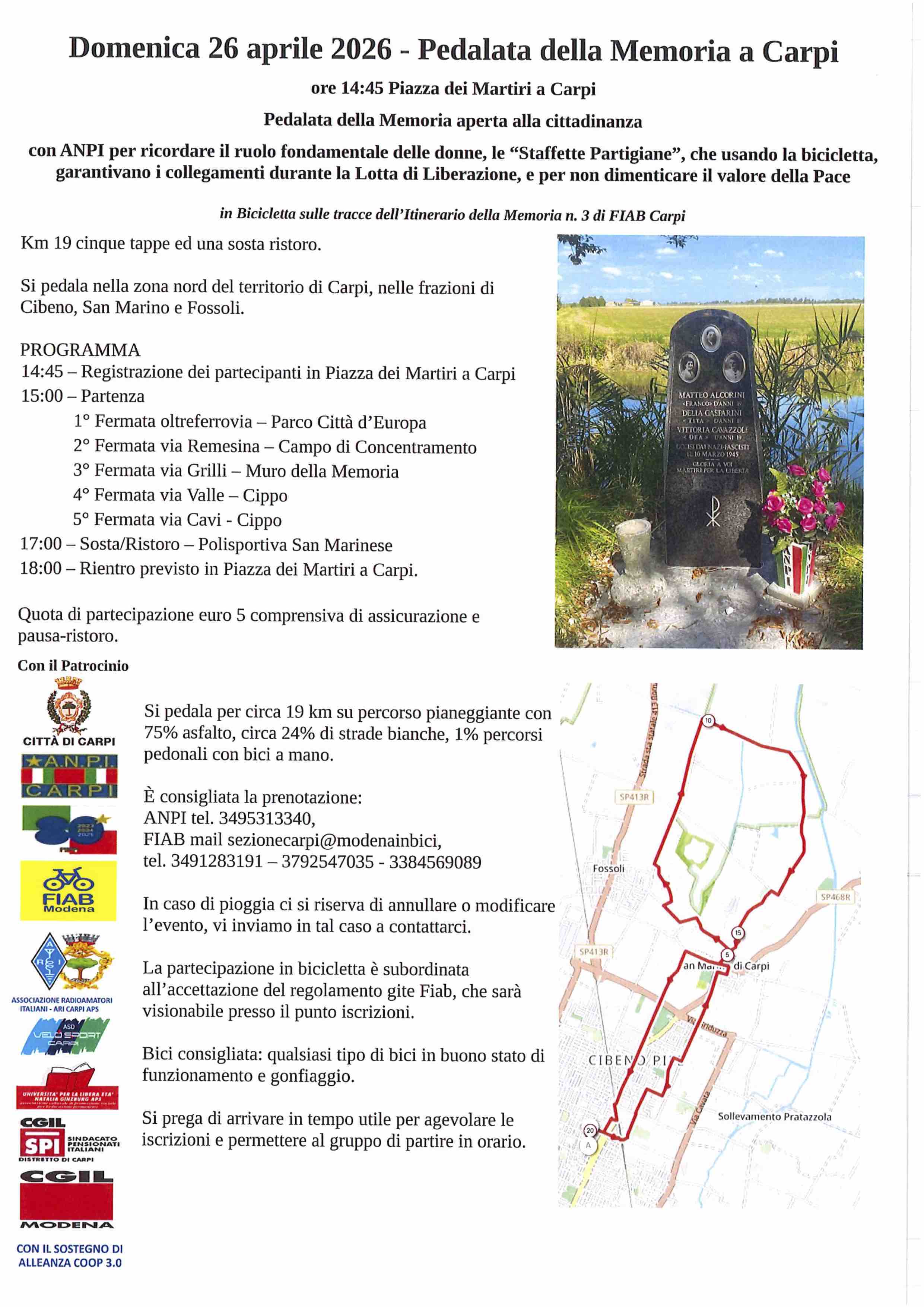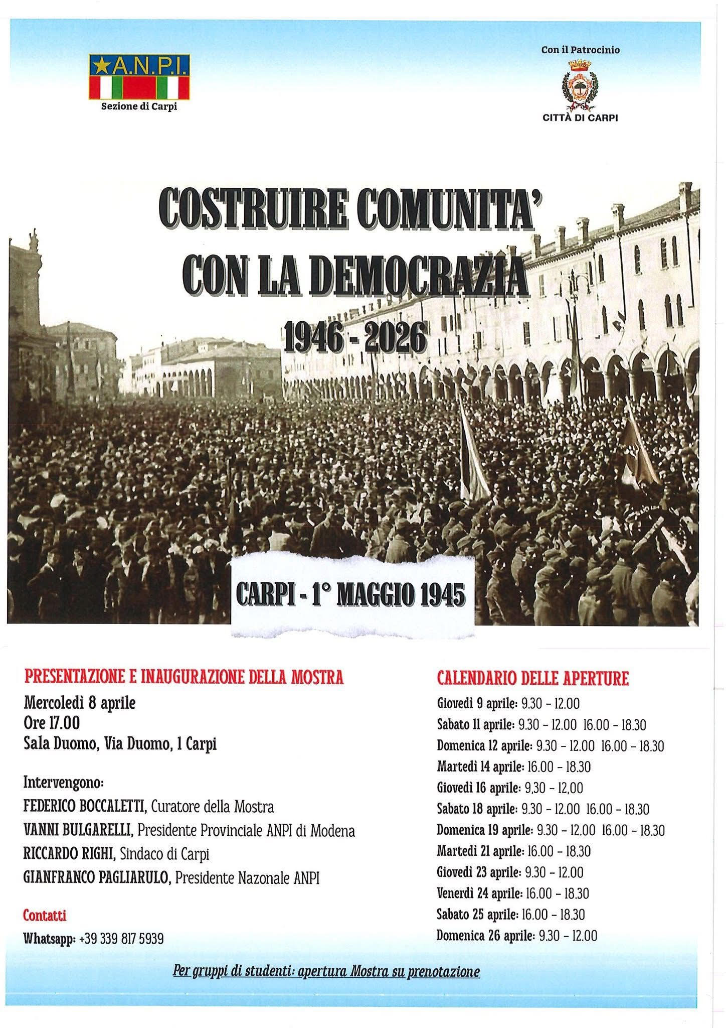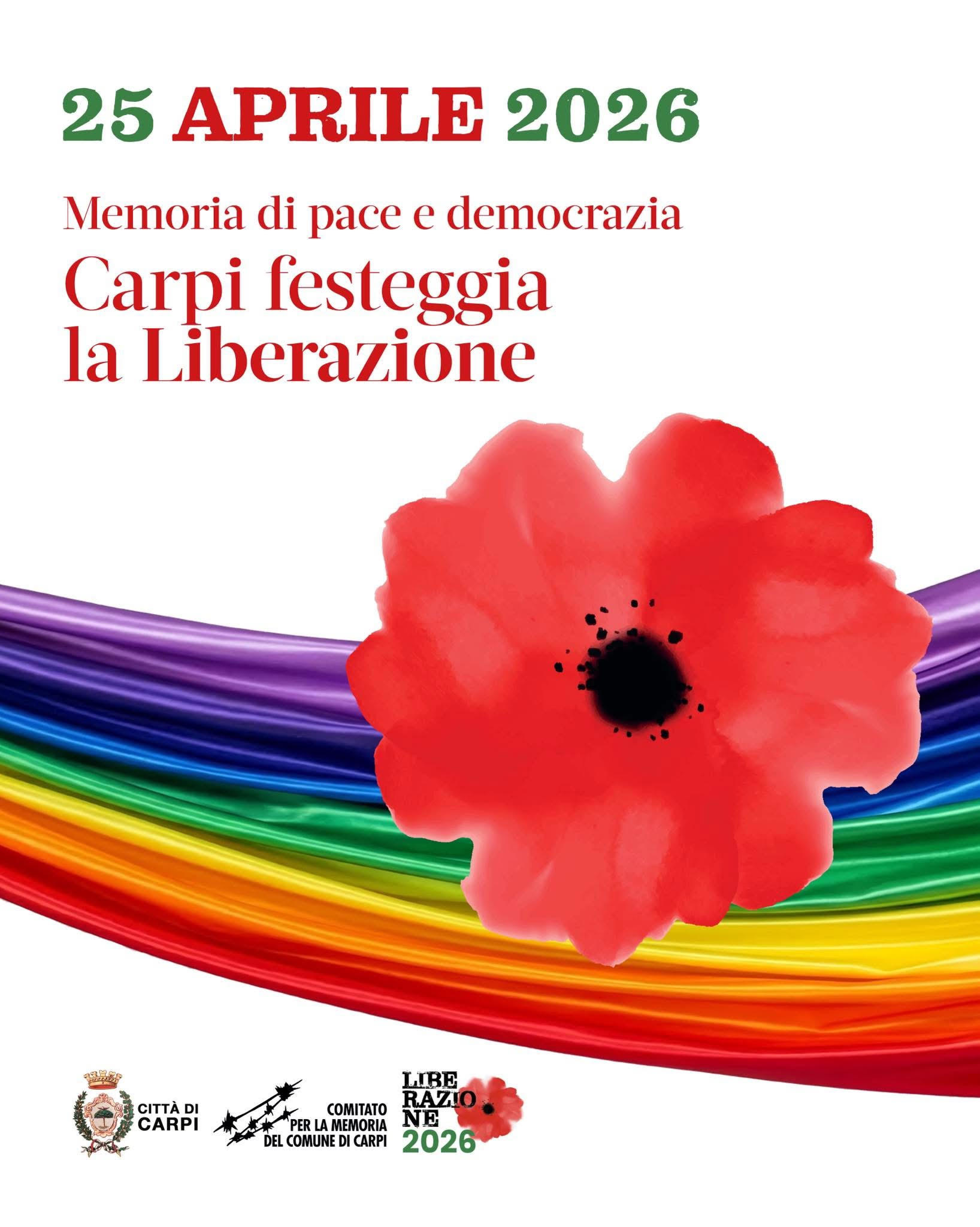 Eventi Festa della Liberazione a Carpi 20 Aprile 2026 - 01 Maggio 2026 Modena Carpi festeggia la Liberazione Allegati Manifesto (246.91 KB) Locandina camminate della memoria (326.07 KB) Mostra "Costruire Comunità" (404.29 KB) Volantino Pedalata (408.67 KB)