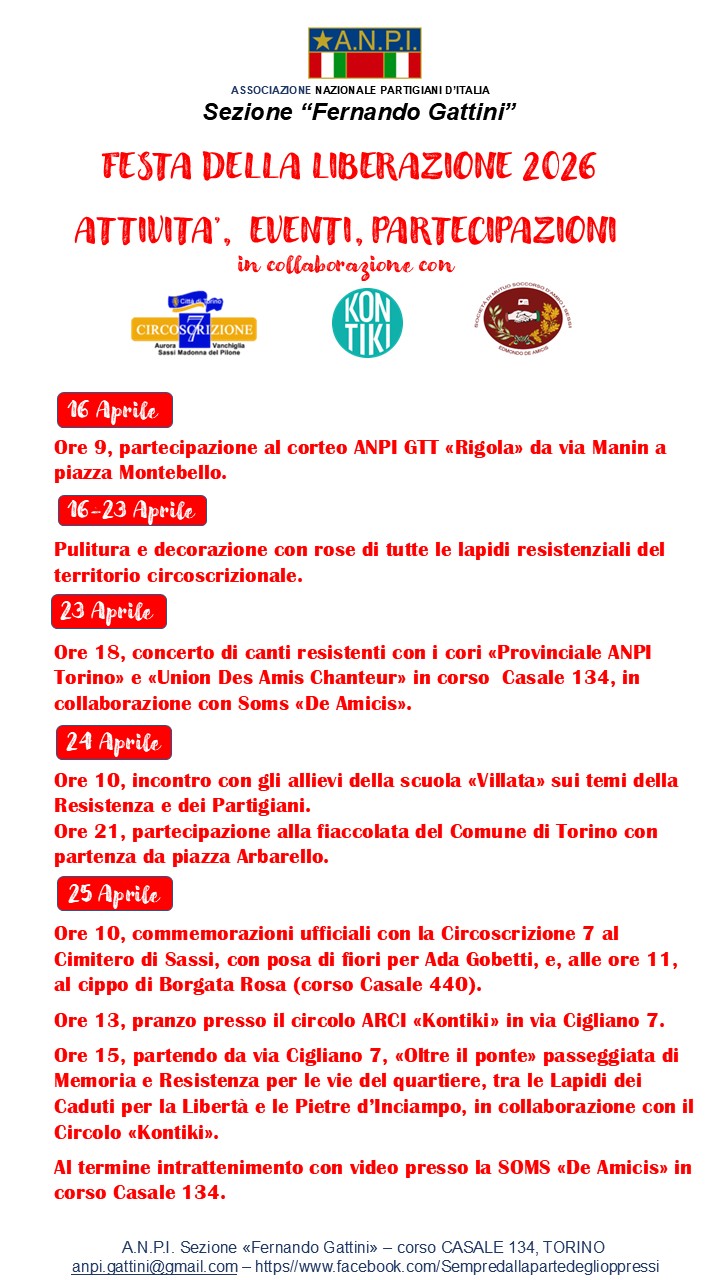 ore 10:00 - commemorazioni ufficiali con la Circoscrizione 7 al Cimitero di Sassi, con posa di fiori per Ada Gobetti, e, alle ore 11:00 - al cippo di Borgata Rosa (corso Casale 440).