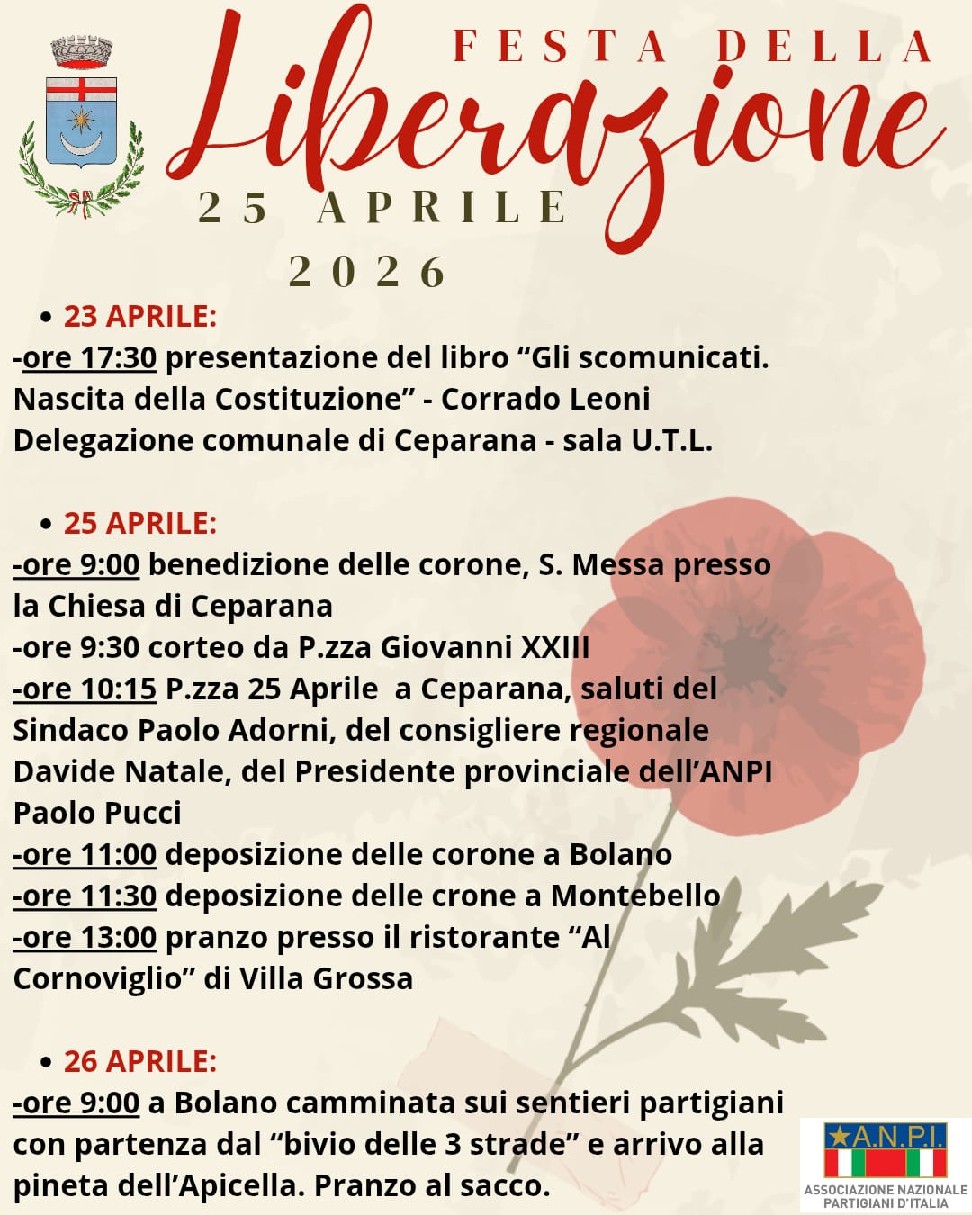 ore 10:15 - P.zza 25 Aprile a Ceparana. saluti del Sindaco Paolo Adorni, del consigliere regionale Davide Natale, del Presidente provinciale ANPI Paolo Pucci