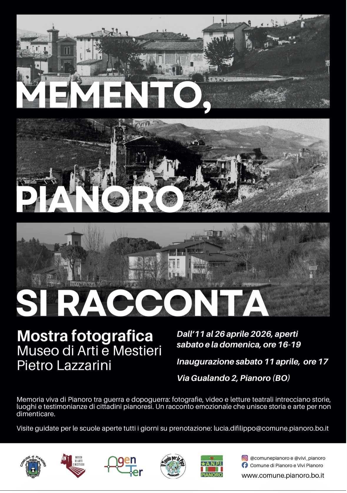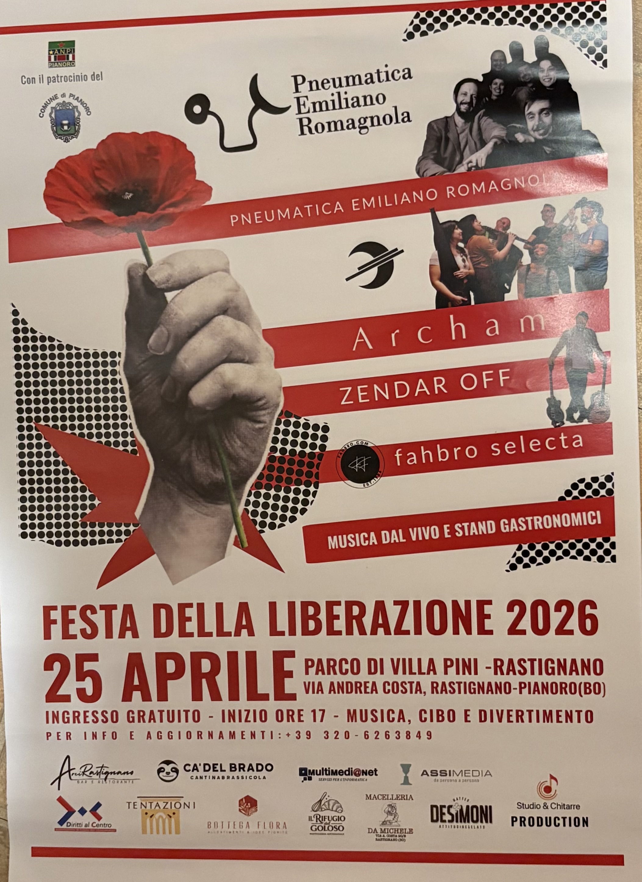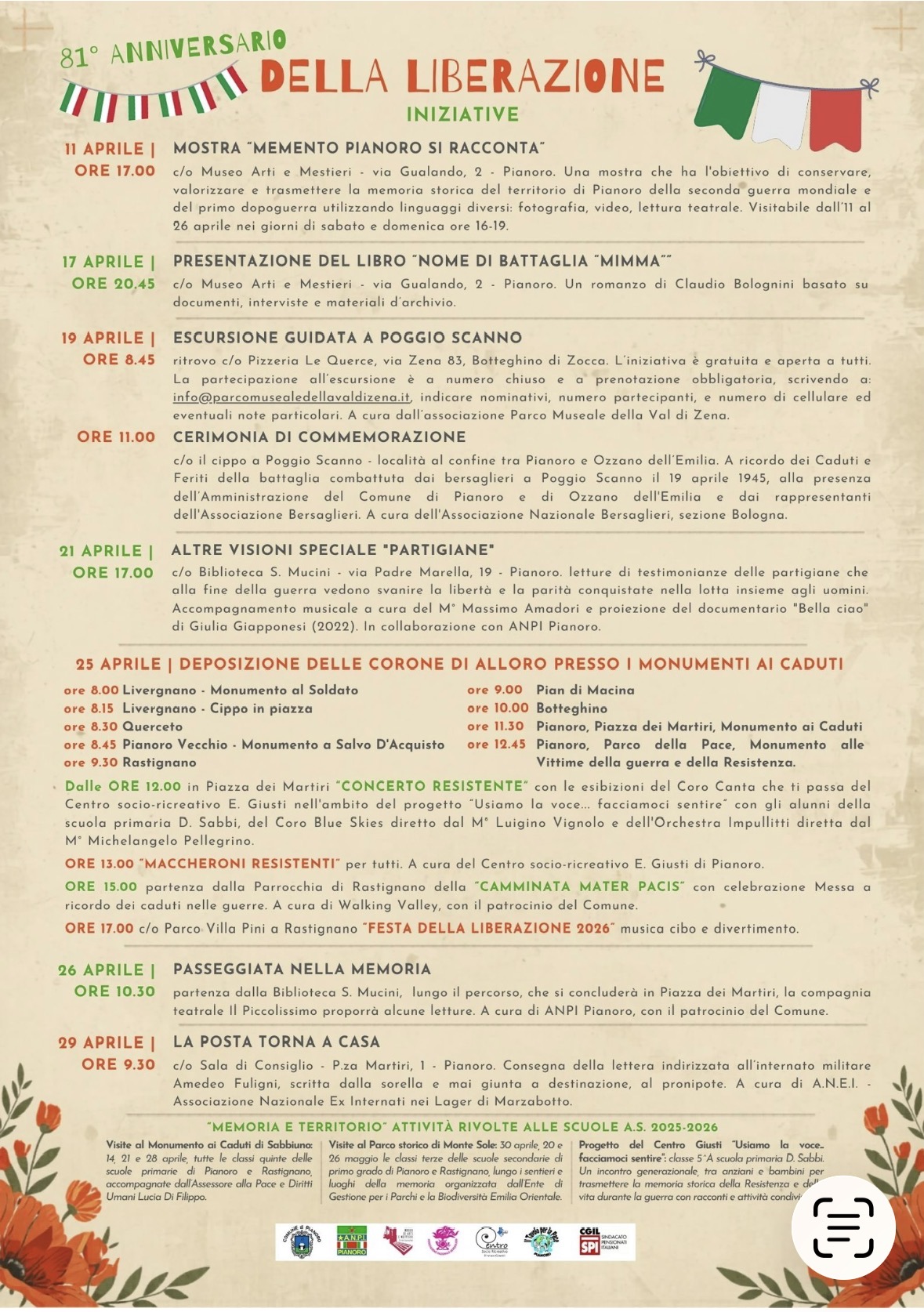 Eventi Festa della Liberazione a Pianoro 11 Aprile 2026 - 25 Aprile 2026 Bologna Numerose iniziative dall'11 al 29 aprile. Allegati Programma iniziative (520.06 KB) Locandina 26 aprile (258.85 KB) Locandina 17 aprile (357.37 KB) Locandina mostra fotografica "Memento, Pianoro si racconta" (534.67 KB) Locandina 25 aprile (1.45 MB)