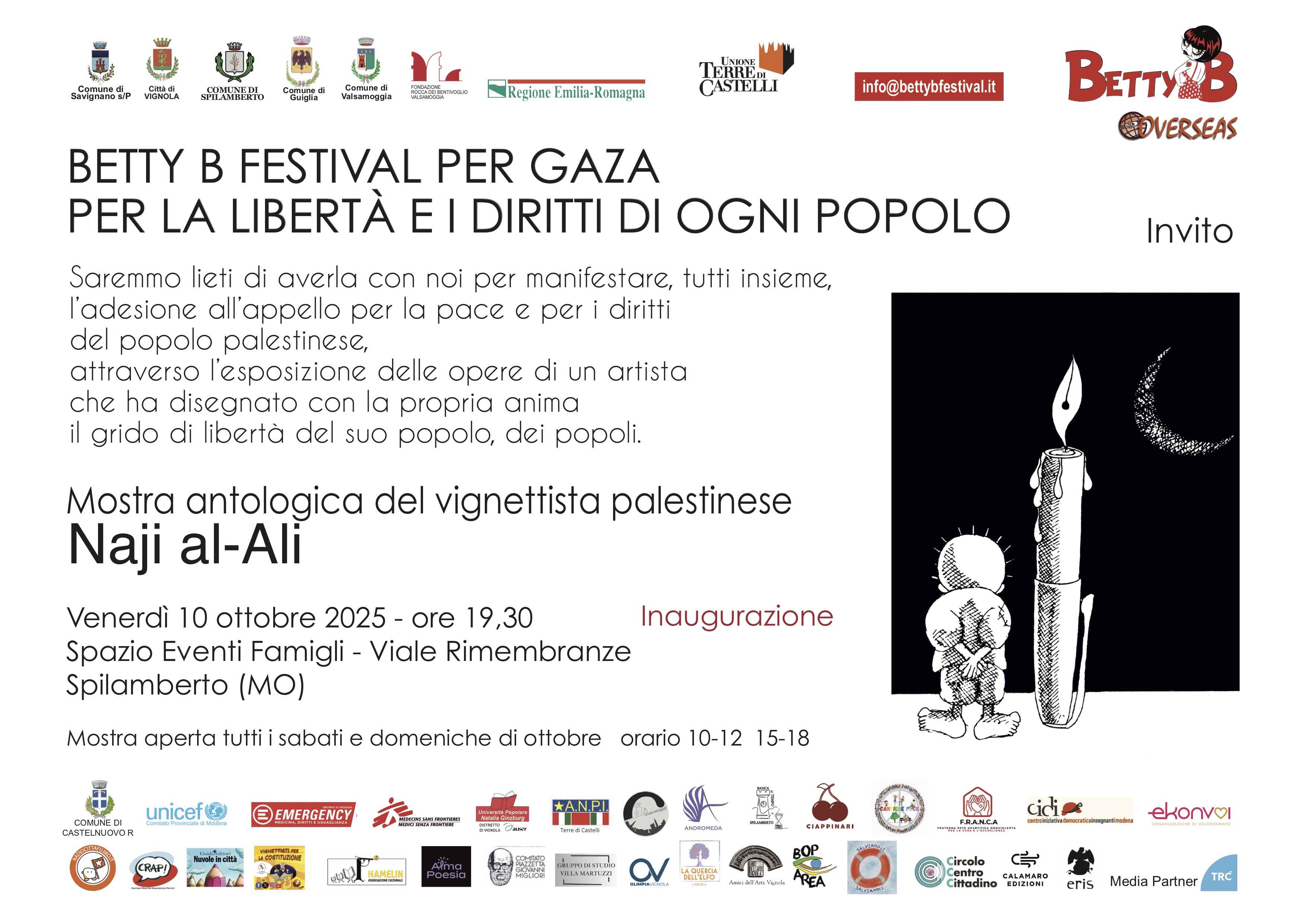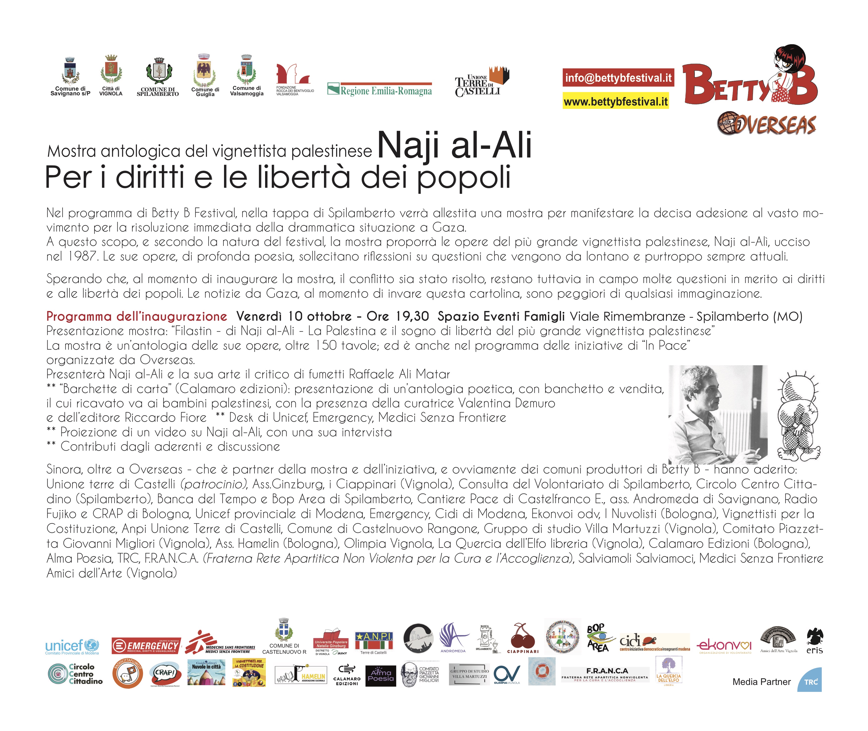 Nel programma di Betty B Festival, nella tappa di Spilamberto verrà allestita una mostra per manifestare la decisa adesione al vasto movimento per la risoluzione immediata della drammatica situazione a Gaza.