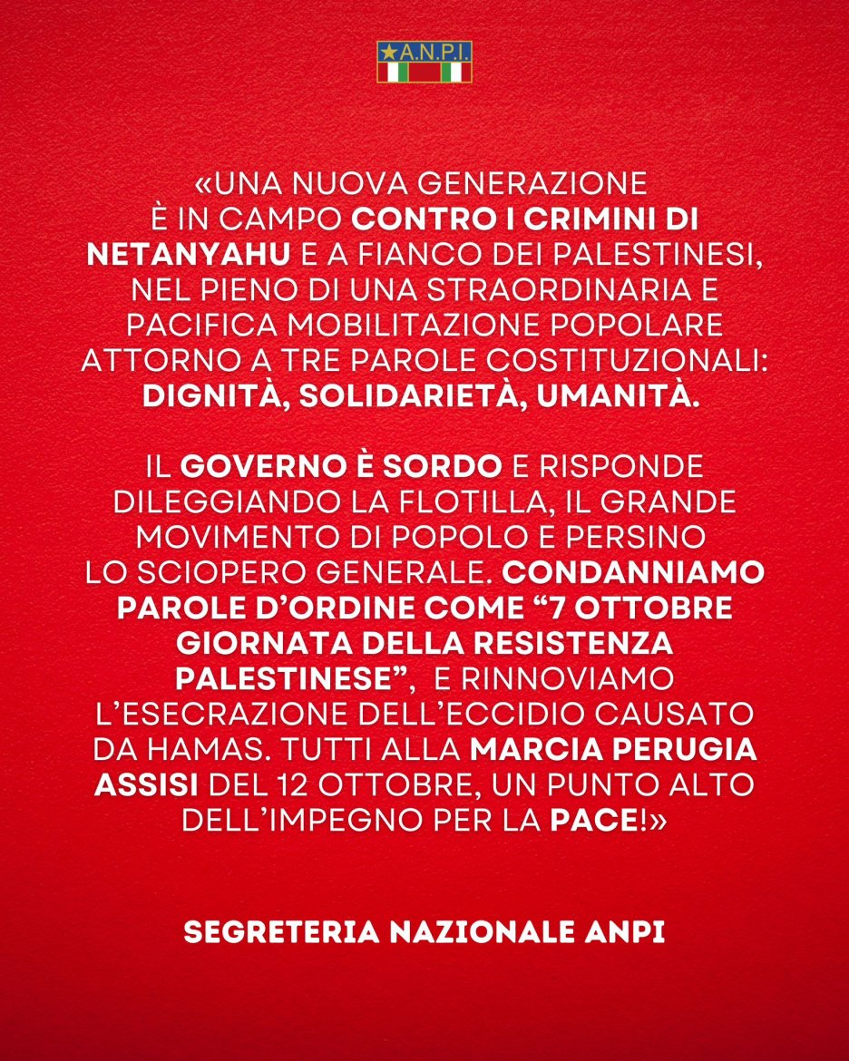 Gli iscritti e i dirigenti dell’ANPI hanno partecipato con impegno e generosità a questa straordinaria e continua mobilitazione. Abbiamo un prossimo appuntamento a cui invitiamo tutte e tutti: la marcia Perugia Assisi del 12 ottobre, che rappresenterà un punto alto dell’impegno per la pace, per il rispetto del diritto internazionale, per Gaza e per i diritti inalienabili del popolo palestinese: si riconosca subito lo Stato di Palestina, si operi in concreto per due popoli in due Stati in reciproca sicurezza, si operi concretamente per l’auto determinazione del popolo palestinese e per il diritto al ritorno.