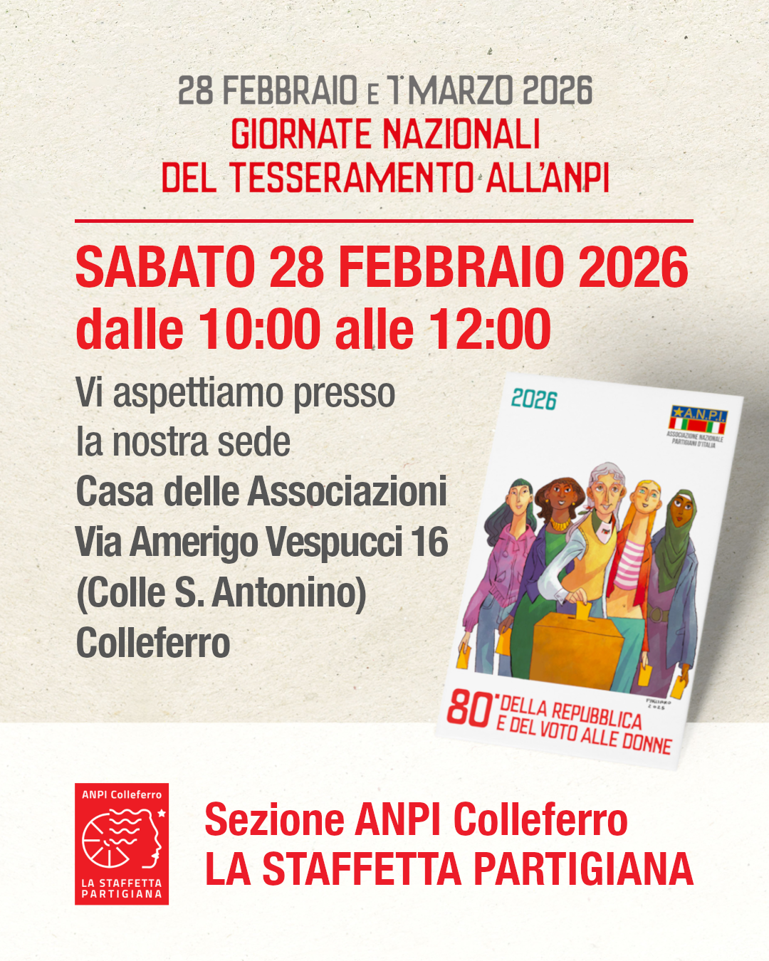 Sabato 28 febbraio 2026 - dalle 10:00 alle 12:00 - apertura straordinaria della Sede ANPI "La staffetta partigiana" di Colleferro c/o la Casa delle Associazioni, via Amerigo Vespucci 16 (Colle S. Antonio) - Colleferro