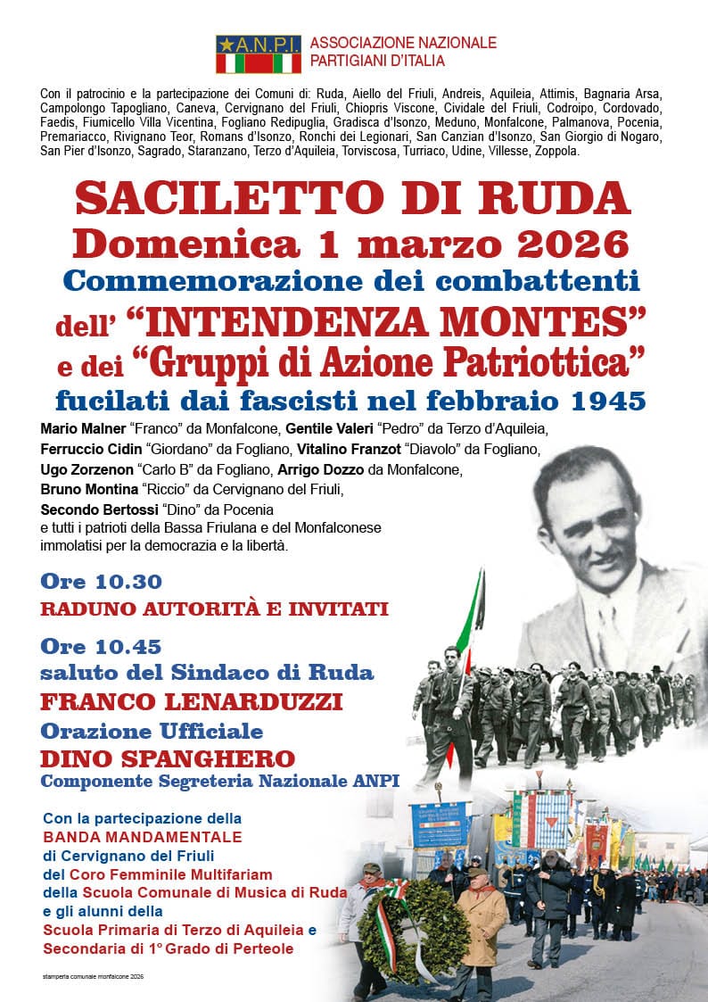 Domenica 1 Marzo la Sezione Anpi di Ruda allestirà il banchetto del tesseramento presso la pista di pattinaggio di Saciletto, in località La Spessa. La cornice è  quella della Commemorazione dei combattenti dell'Intendenza MONTES e dei Gruppi di Azione Patriottica