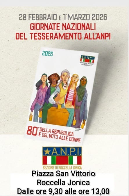 Eventi Giornate del tesseramento a Roccella Jonica 28 Febbraio 2026 - 01 Marzo 2026 Reggio Calabria La Sezione ANPI vi aspetta in Piazza San Vittorio dalle ore 9:30 alle ore 13:00 Allegati Locandina (57.57 KB)