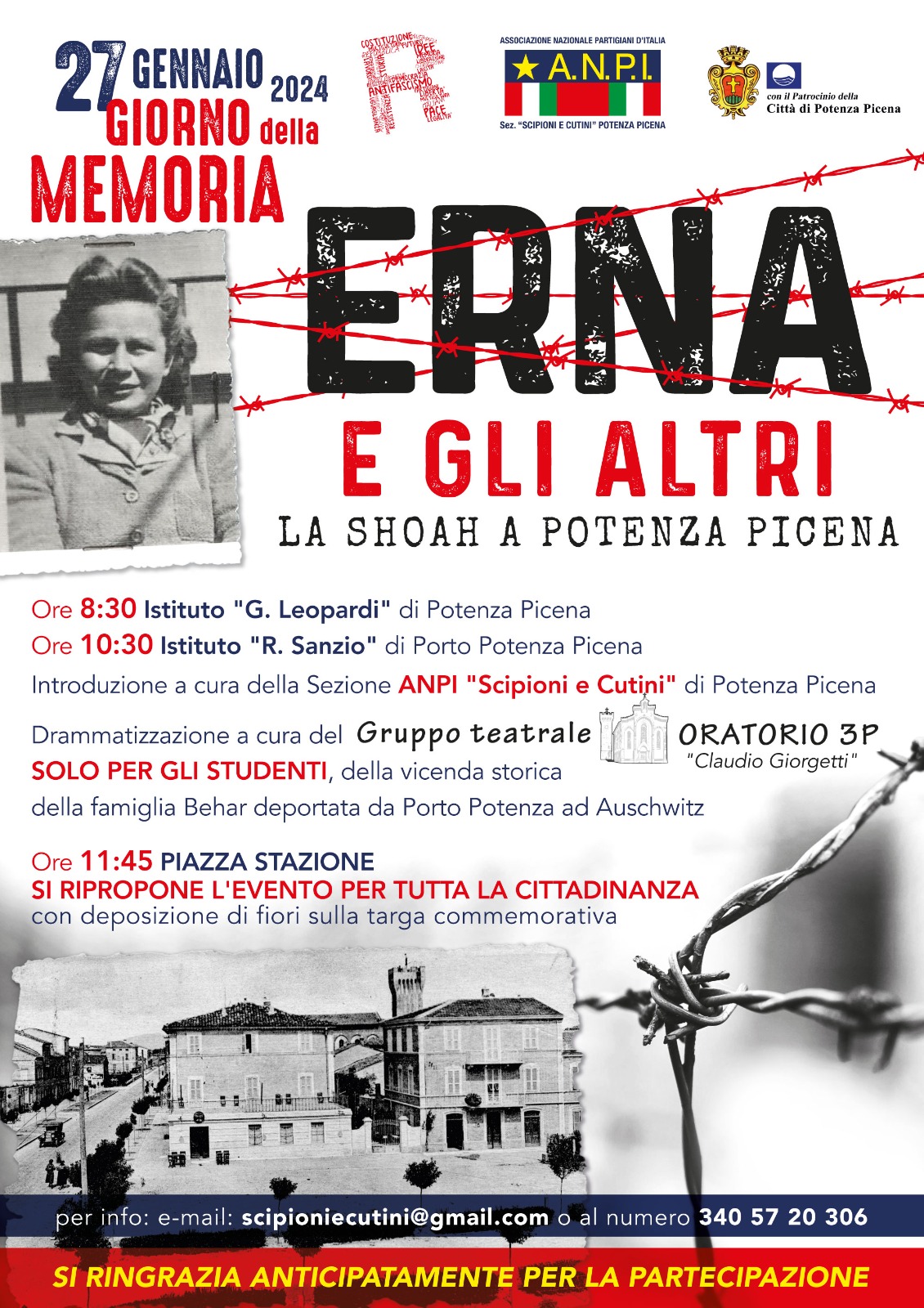 - Deposizione di fiori sulla targa commemorativa e breve drammatizzazione della vicenda storica dei quattro componenti della famiglia Behar catturati dai nazifascisti perché ebrei a Porto Potenza nel novembre del 1943 e deportati nel campo di sterminio di Auschwitz da dove non hanno fatto più ritorno.