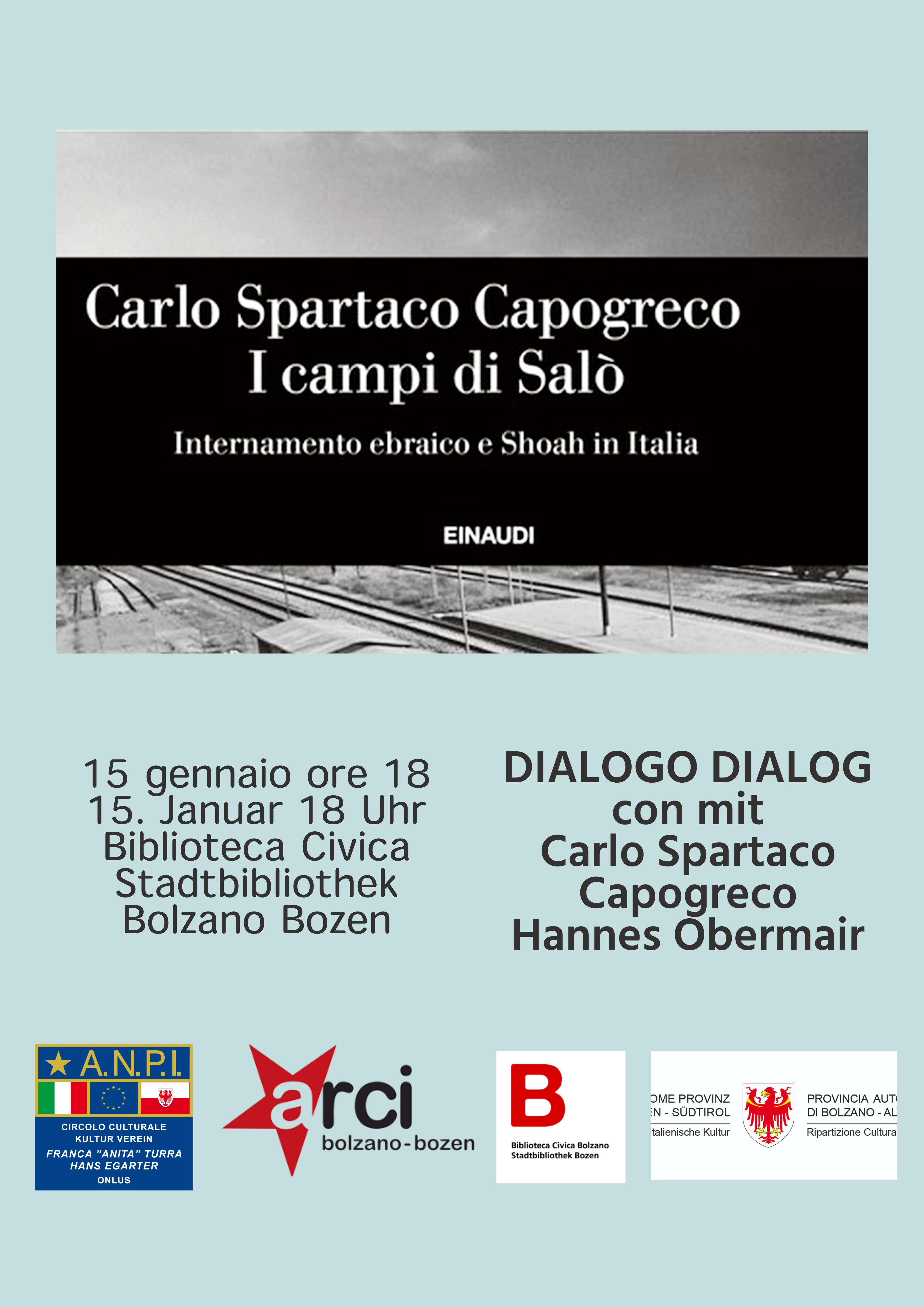 Promosso da Biblioteca Civica "Cesare Battisti", Circolo Culturale ANPI Franca "Anita" Turra-Hans Egarter, in collaborazione con ARCI Bolzano Bozen e della Nuova Libreria Cappelli, con il sostegno degli Assessorati alla Cultura del Comune di Bolzano e della Provincia.