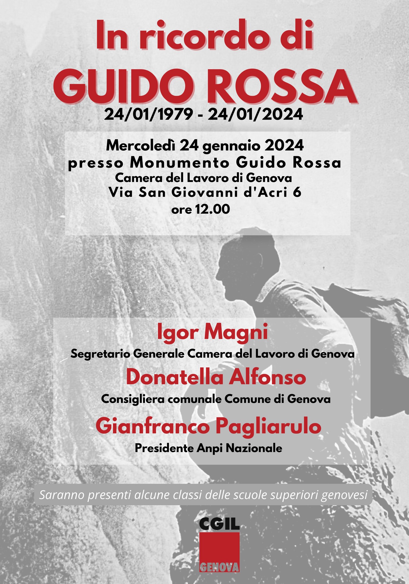 Il 24 gennaio, 45° anniversario dell'omicidio a Genova dell'operaio e sindacalista Guido Rossa da parte deli terroristi delle brigate rosse, CGIL e ANPI daranno vita ad iniziative commemorative in città. Alle 9 in Via Fracchia, luogo dell'omicidio, saranno presenti Marco Bucci, Sindaco di Genova, Daniela Marziano, Assessore Municipio 1 Centro est e Gianfranco Pagliarulo, Presidente nazionale ANPI. Alle 10 allo Stabilimento acciaierie d'Italia di Genova Cornigliano, prenderanno la parola Giovanni Toti, Presidente della Regione Liguria, Marco Bucci, Sindaco di Genova, Don Franco Molinari, cappellano del lavoro, Gianfranco Pagliarulo, Presidente nazionale ANPI, Luca Maestripieri, Segretario generale CISL Liguria, Mario Ghini, Segretario generale UIL Liguria, Franco Henriquet, Presidente della Fondazione Gigi Ghirotti, Michele De Palma, Segretario generale FIOM-CGIL. Alle 12 presso il Monumento a Guido Rossa interverranno Igor Magni, Segretario generale CGIL Genova, Donatella Alfonso, Consigliera Comune di Genova e Gianfranco Pagliarulo, Presidente nazionale ANPI.