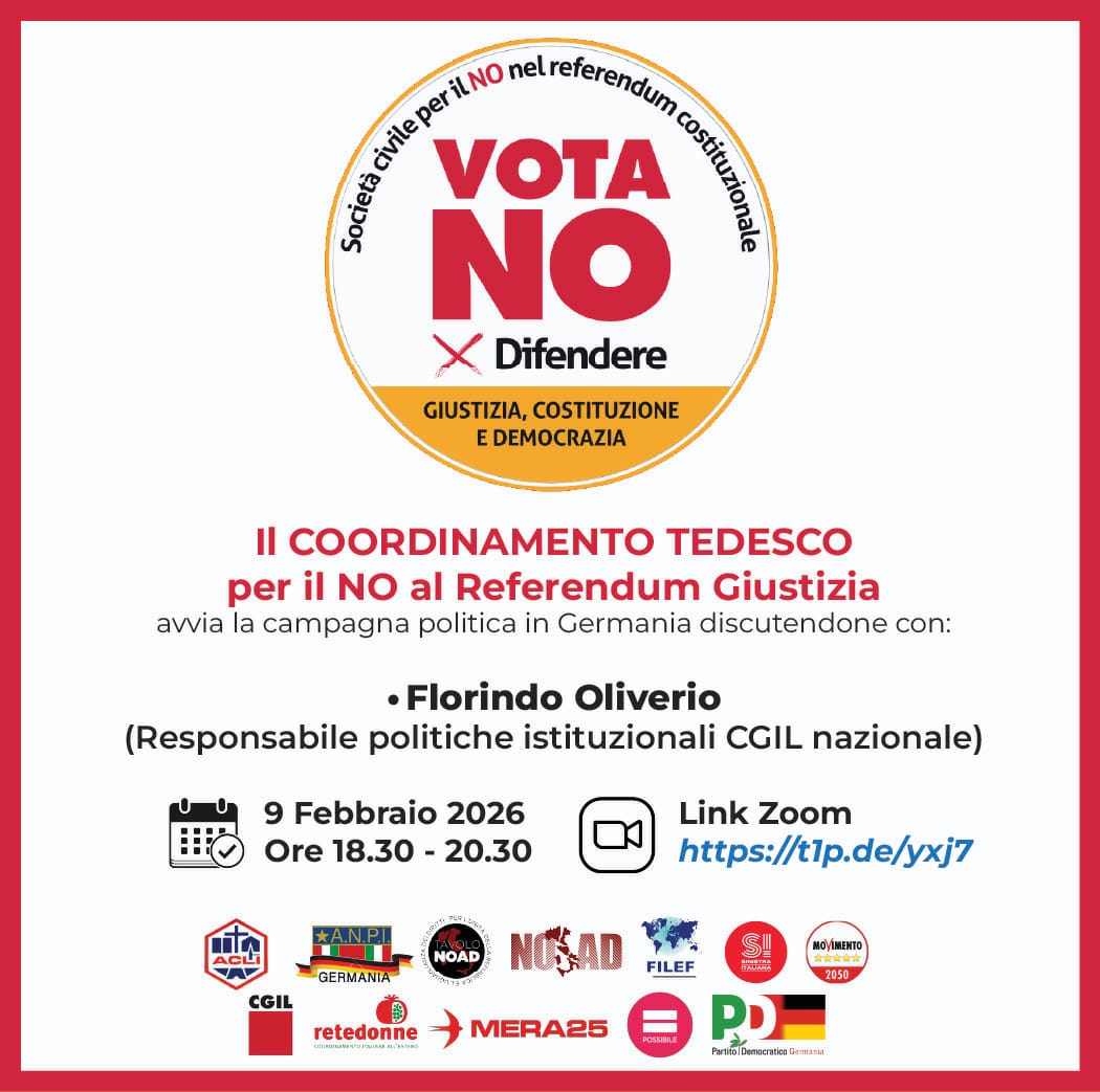 Il Coordinamento Tedesco per il NO dà il via alla campagna politica per portare al voto il maggior numero possibile di italiani residenti all'estero. Grazie alla disponibilità di Florindo Oliverio, avremo l'opportunità di incontrarci per approfondire insieme non solo il contenuto del quesito, ma anche il significato politico di una auspicata vittoria dei NO; vittoria che riteniamo avrà un peso significativo anche per la comunità degli italiani all'estero. Sarà un momento di confronto e di chiarimento particolarmente importante. Questa consultazione non prevede quorum: ogni voto conta davvero. Proprio per questo, la partecipazione diventa un elemento centrale e decisivo, che dobbiamo sostenere e promuovere con il massimo impegno. Vi invitiamo quindi a partecipare e a diffondere l'iniziativa