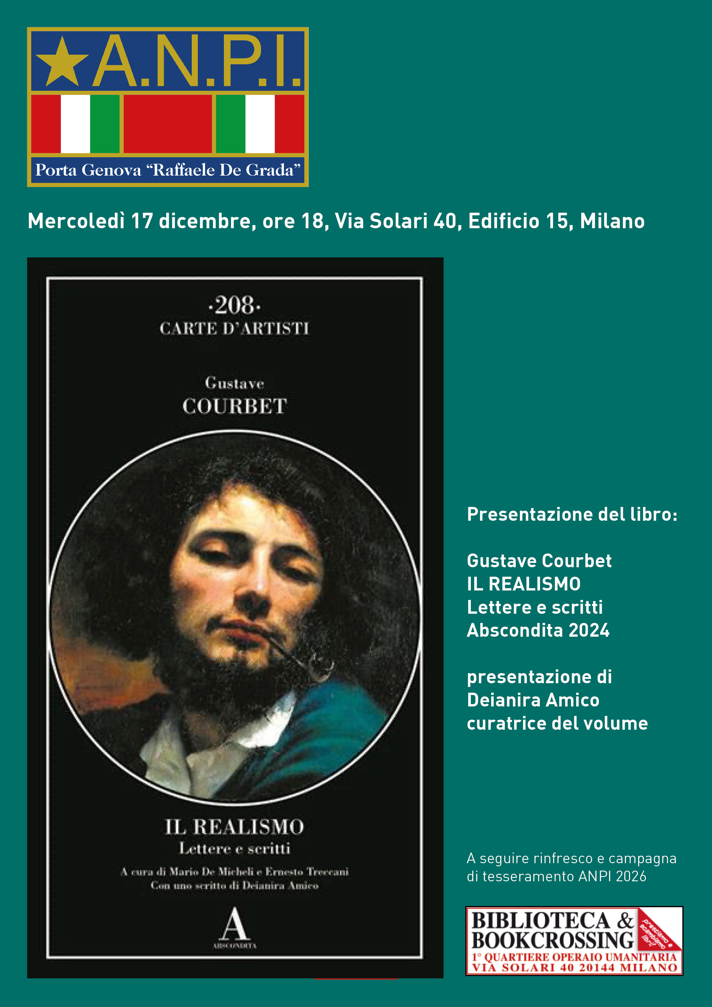 Presentazione del libro Gustave Courbet, Il Realismo, Lettere e scritti (Abscondita 2024), con una selezione di opere di Courbet, di Deianira Amico, curatrice del volume, storica dell'arte e docente di storia dell'arte al Politecnico di Milano. A seguire rinfresco prenatalizio e campagna di tesseramento ANPI 2026.