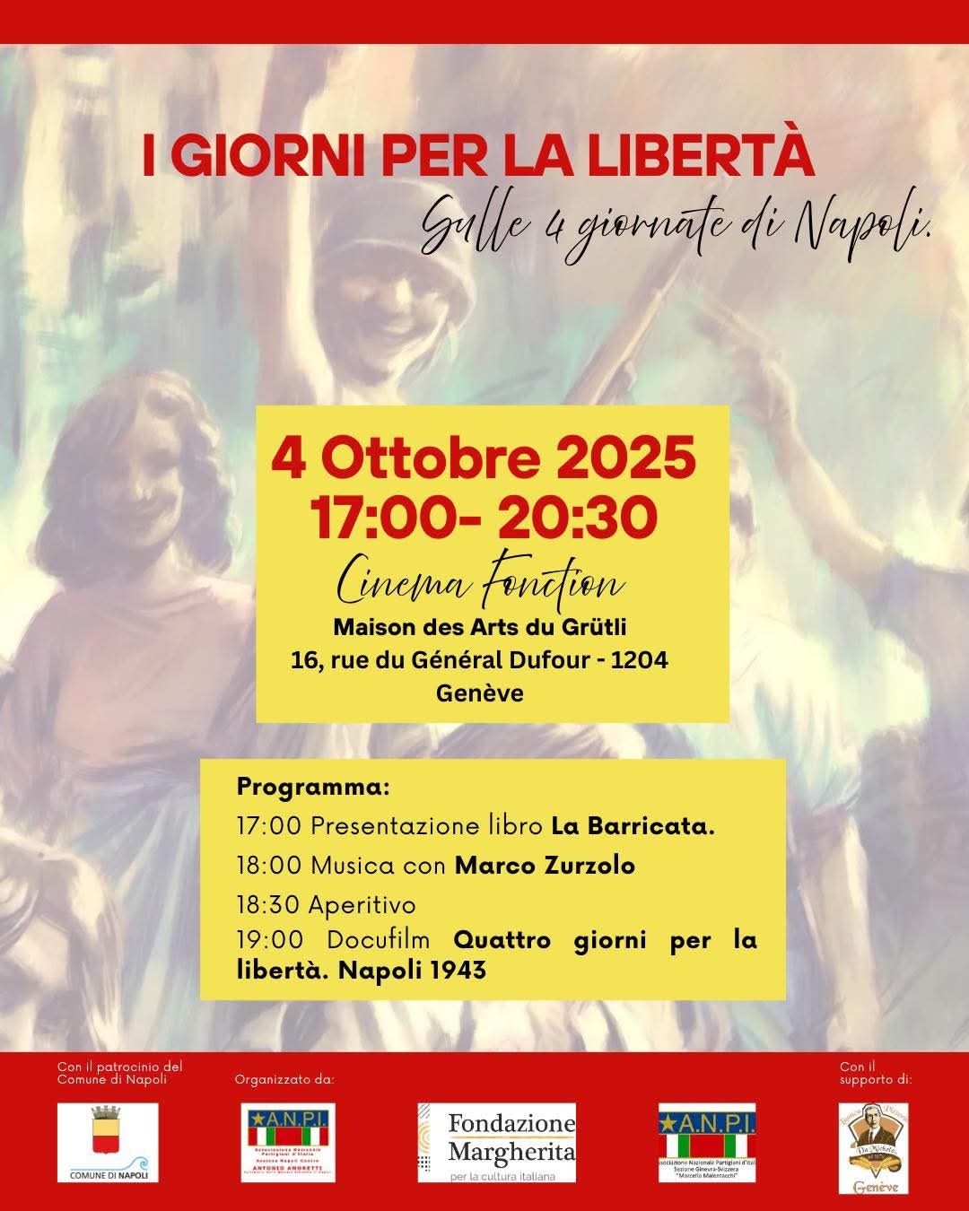 L’incontro si terrà il 4 ottobre a partire dalle 17,00 presso il Cinema Fonction, Maison des arts du Grütli, Ginevra e sarà una serata di cultura e musica per ricordare la resistenza del popolo napoletano nel 1943.
