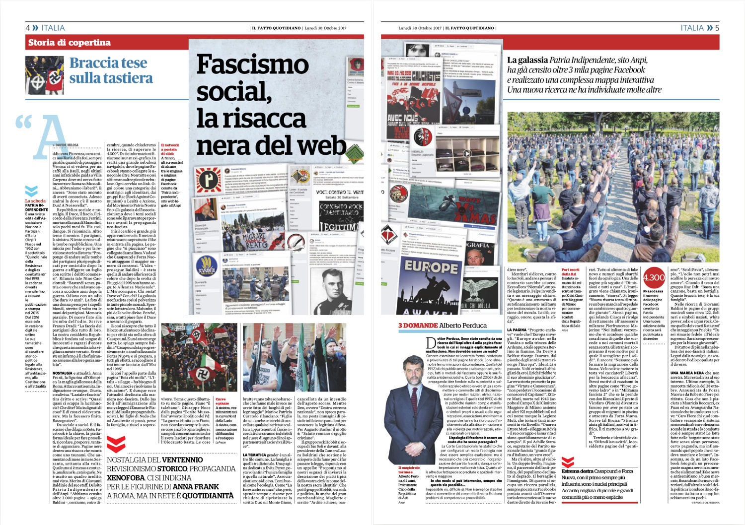 "Oggi sul Fatto quotidiano due pagine dal titolo “Fascismo sociale, la risacca nera del web”, a cura di Davide Milosa. Molto ampie le citazioni da e di Patria indipendente, a conferma della diffusione crescente del periodico dell'Anpi nazionale, della sua presenza tempestiva sui temi dell'antifascismo, della sua indubbia autorevolezza. D'altra parte è da mesi che Patria è sempre più presente sulla carta stampata e sul web, in particolare in merito all'inchiesta sulla “galassia nera”, a cura di Giovanni Baldini, pubblicata proprio sul periodico online per la prima volta il 19 dicembre 2016. Noi, che siamo rispettivamente il direttore del periodico e il responsabile nazionale della comunicazione dell'ANPI, prendiamo atto con vivo compiacimento del bel servizio sul “Fatto” e della affermazione sempre più evidente di Patria indipendente nel panorama della stampa online del nostro Paese".