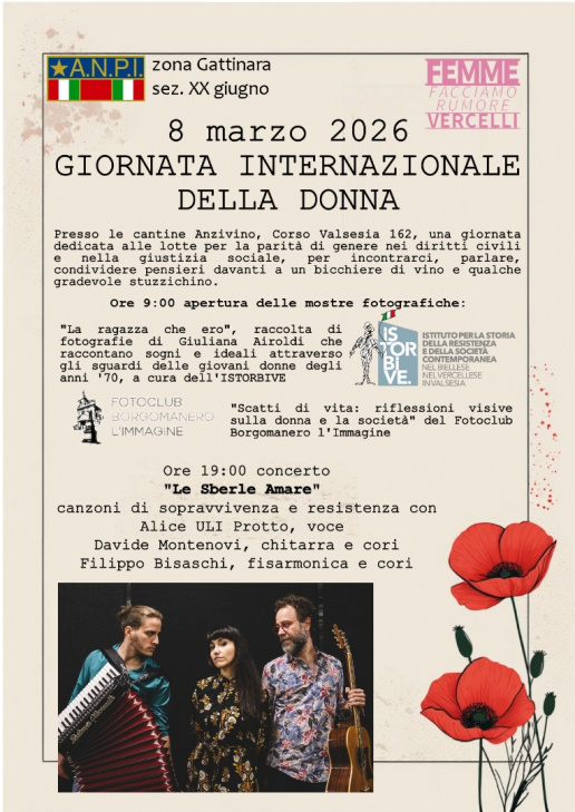 Domenica 8 marzo 2026, l'Anpi zona Gattinara sezione XX giugno e il coordinamento Femme Vercelli-Facciamo rumore organizzano a Gattinara, alle cantine Anzivino (corso Valsesia 162), una giornata dedicata alle lotte per la parità di genere nell'occasione della Giornata internazionale della donna.