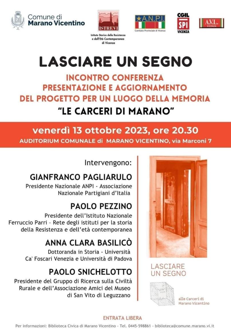 Le carceri naziste di Marano Vicentino diventeranno Luogo della Memoria. Erano situate nella scuola elementare del paese e vi furono rinchiusi e torturati i partigiani. Domani 13 ottobre la presentazione del progetto Promosso dal Comune, dalle associazioni della Resistenza, tra cui l' ANPI provinciale, da Istrevi Istituto Resistenza Vicenza e dallo Spi Cgil di Vicenza. Interverrà, tra gli altri, il Presidente nazionale ANPI, Gianfranco Pagliarulo