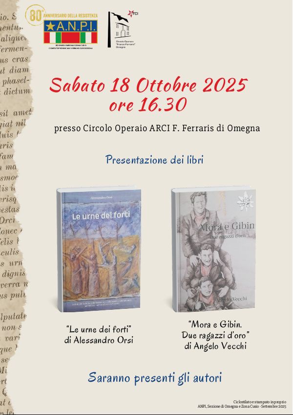 L'iniziativa, che prevede nell'occasione anche la presentazione del volume Mora e Gibin due ragazzi d'oro di Angelo Vecchi, è organizzata dall'Anpi sezione Omegna e Zona Cusio-Comitato provinciale Verbano Cusio Ossola.