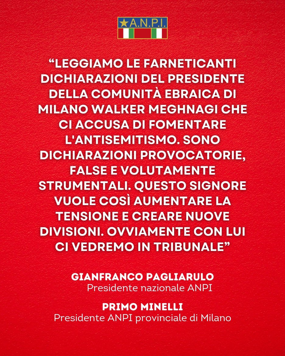 "Leggiamo le farneticanti dichiarazioni del Presidente della comunità ebraica di Milano Walker Meghnagi che ci accusa di fomentare l'antisemitismo. Ci vedremo in tribunale"