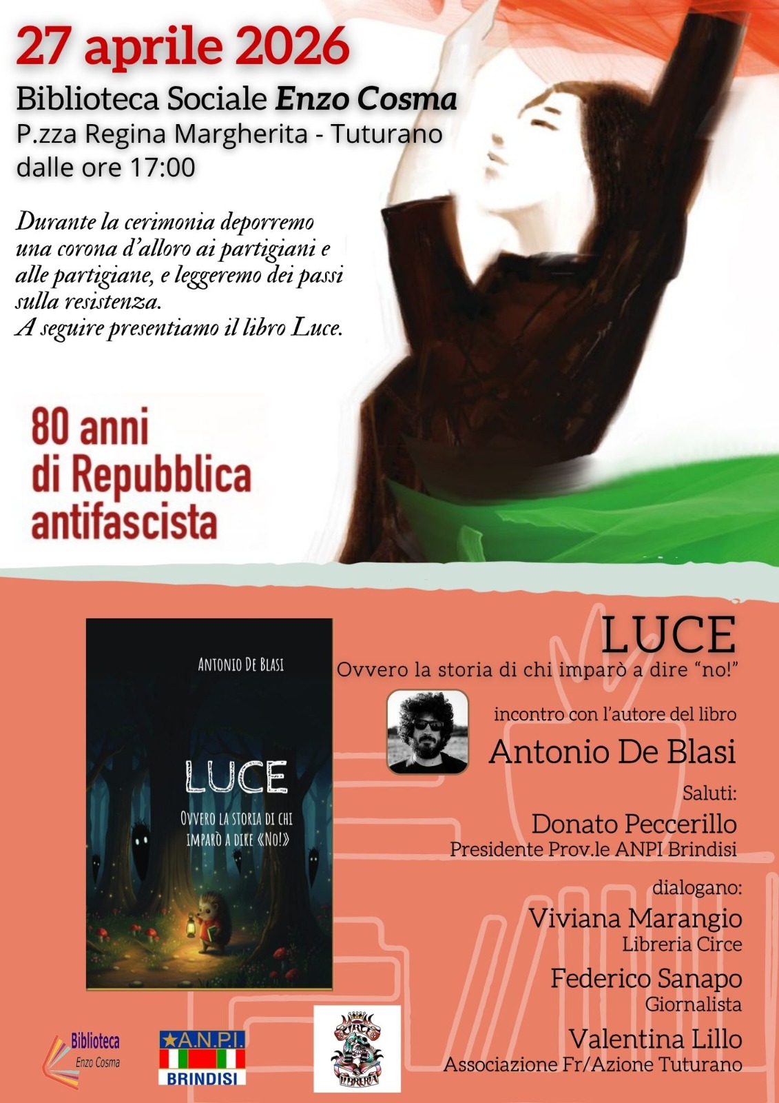 Dopo i saluti di Donato Peccerillo, Presidente provinciale ANPI Brindisi, dialogheranno con l'autore Viviana Marangio fondatrice e curatrice della Libreria Circe, Federico Sanapo, giornalista, Lillo Valentina dell' associazione Fr/Azione Tuturano.
