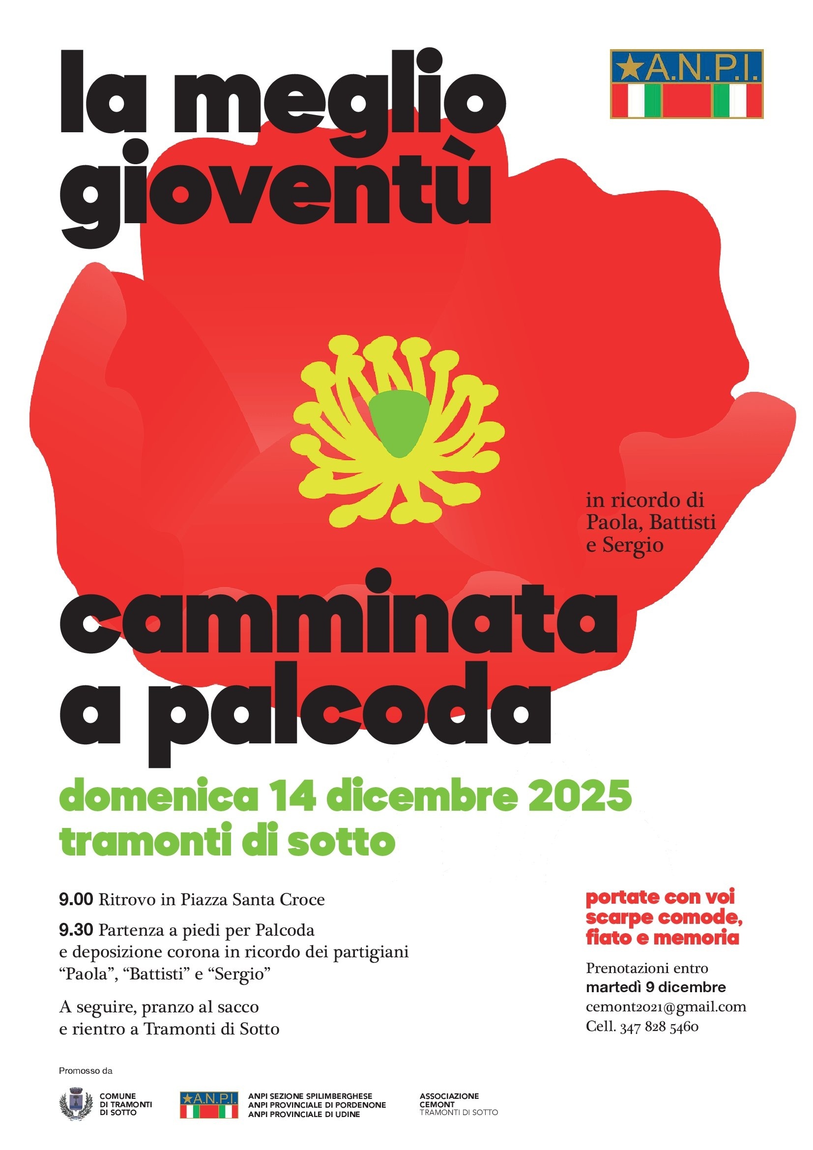 Nel territorio di Tramonti di Sotto, la memoria sarà tramandata anche con un'escursione, che si svolgerà domenica 14 dicembre. Per quanti vorranno prendervi parte, l'appuntamento è fissato alle 9.00, in piazza Santa Croce, da cui poi inizierà la camminata per Palcoda. Il programma prevede la deposizione di una corona in ricordo di Paola, Sergio e Battisti, che persero la loro vita in quel luogo. Seguirà pranzo al sacco e il rientro a Tramonti di Sotto. Gli interessati a prendere parte all'escursione, potranno prenotare entro martedì 9 dicembre: e-mail, cemont2021@gmail.com; cel, 347.8285460.