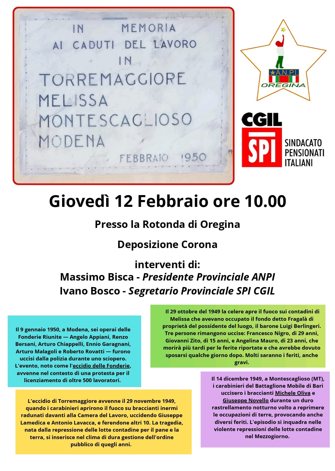 In memoria dei Caduti del lavoro in Torremaggiore, Melissa, Montescaglioso, Modena
