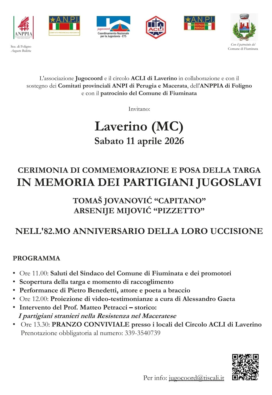 L'associazione Jugocoord e il circolo ACLI di Laverino in collaborazione e con il sostegno dei Comitati provinciali ANPI di Perugia e Macerata, dell'ANPPIA di Foligno e con il patrocinio del Comune di Fiuminata