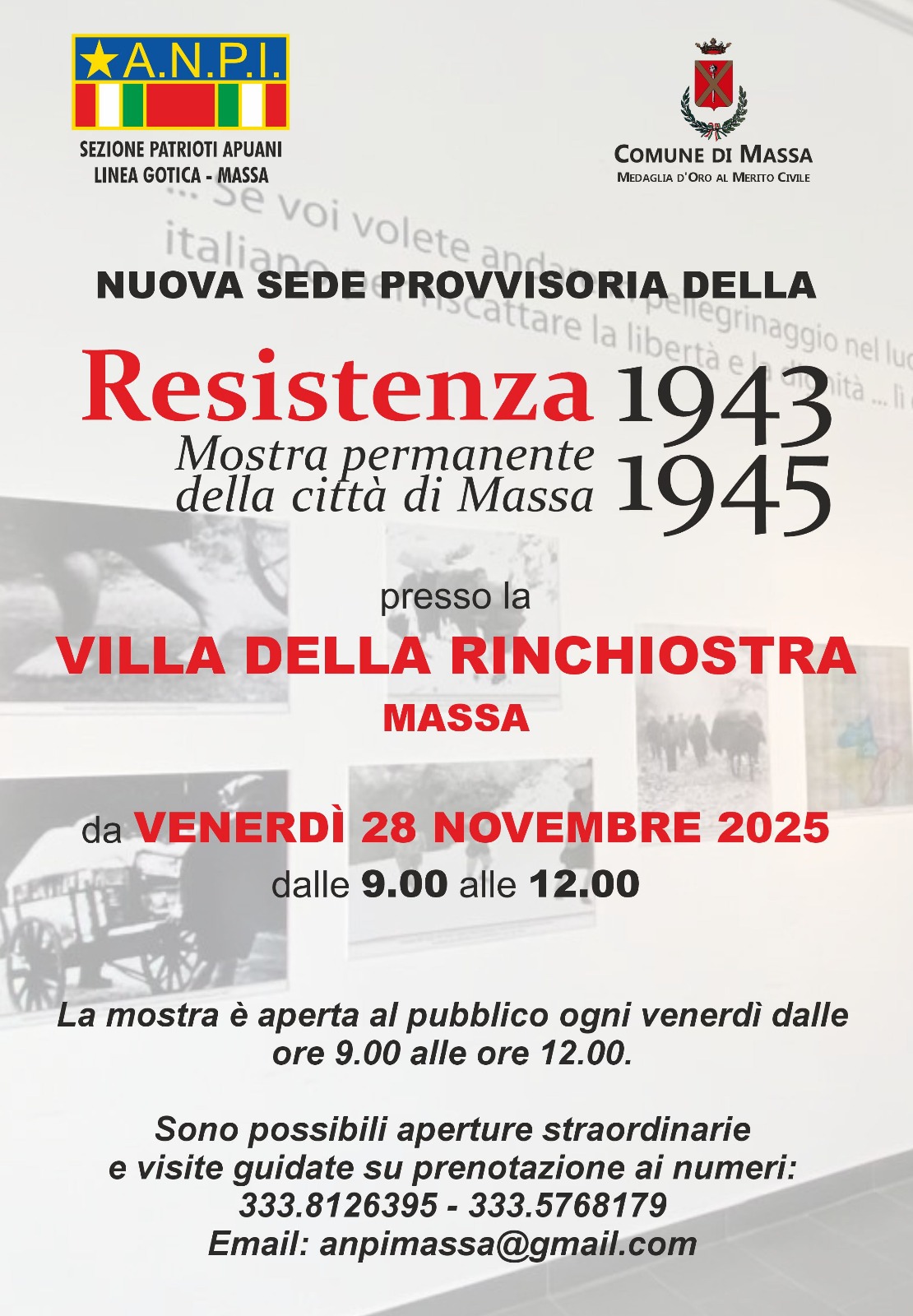 L’ANPI di Massa invita a visitare la Mostra allestita nella nuova sede temporanea di Villa della Rinchiostra, in attesa della collocazione definitiva nel nuovo edificio in costruzione nel Piazzale Partigiani