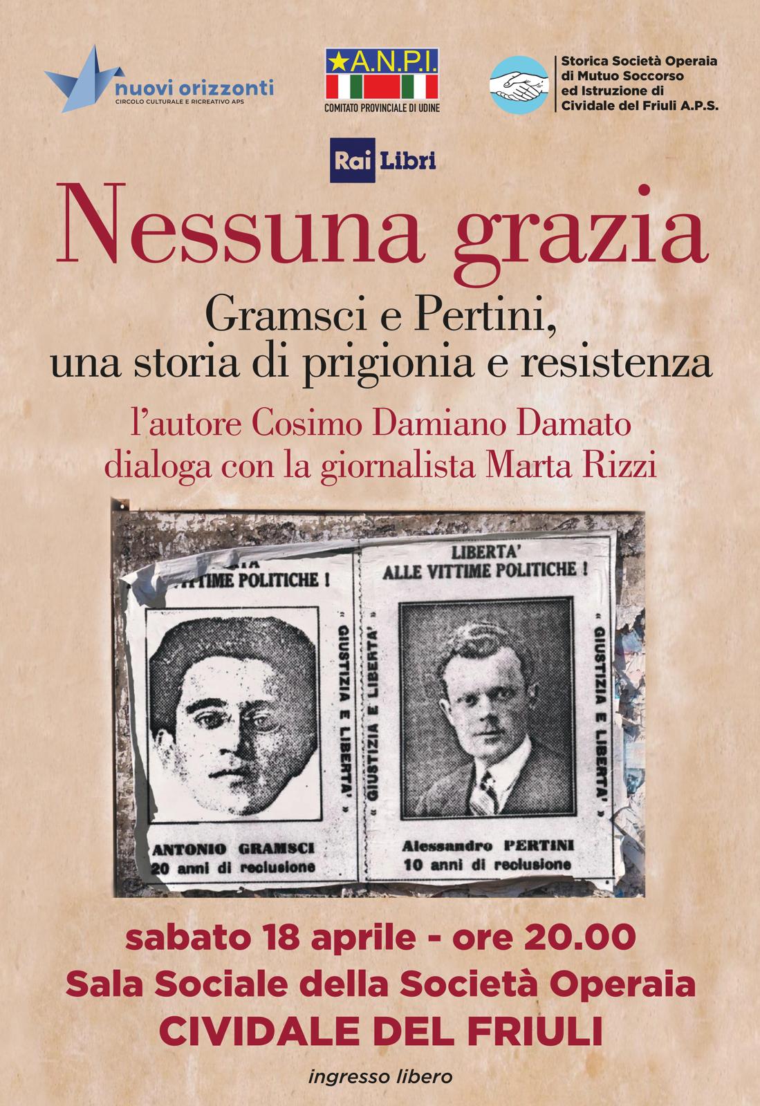 Poi, domenica 19 aprile, alle 18.00, sarà protagonista al circolo Nuovi Orizzonti (in via Brescia, 3) di Udine. Nel corso dei due appuntamenti, in dialogo con la giornalista Marta Rizzi, l'autore offrirà un ritratto approfondito di due figure fondamentali della storia italiana. Perseguitati dal regime fascista, nel 1930 l'onorevole comunista Antonio Gramsci e l'avvocato socialista Sandro Pertini condivisero quasi un anno di prigionia, nel carcere pugliese di Turi. Dopo un'iniziale diffidenza, dovuta alle diverse opinioni politiche, tra loro si sviluppò una fraterna amicizia.