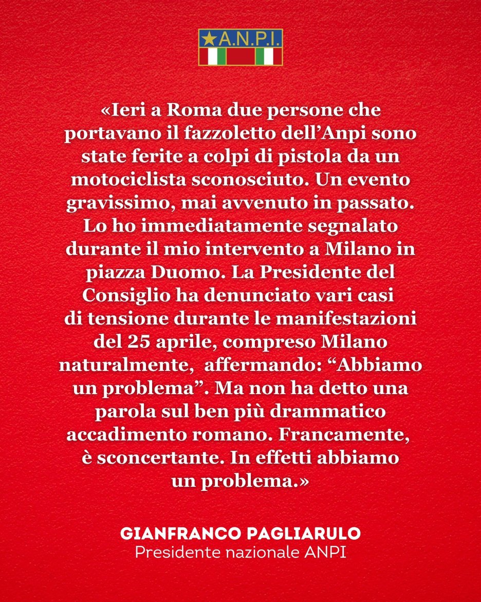 "Ieri a Roma due persone che portavano il fazzoletto dell'Anpi sono state ferite a colpi di pistola da un motociclista sconosciuto. Un evento gravissimo, mai avvenuto in passato. Lo ho immediatamente segnalato durante il mio intervento a Milano in piazza Duomo. La Presidente del Consiglio ha denunciato vari casi di tensione durante le manifestazioni del 25 aprile, compreso Milano naturalmente, affermando: "Abbiamo un problema ".