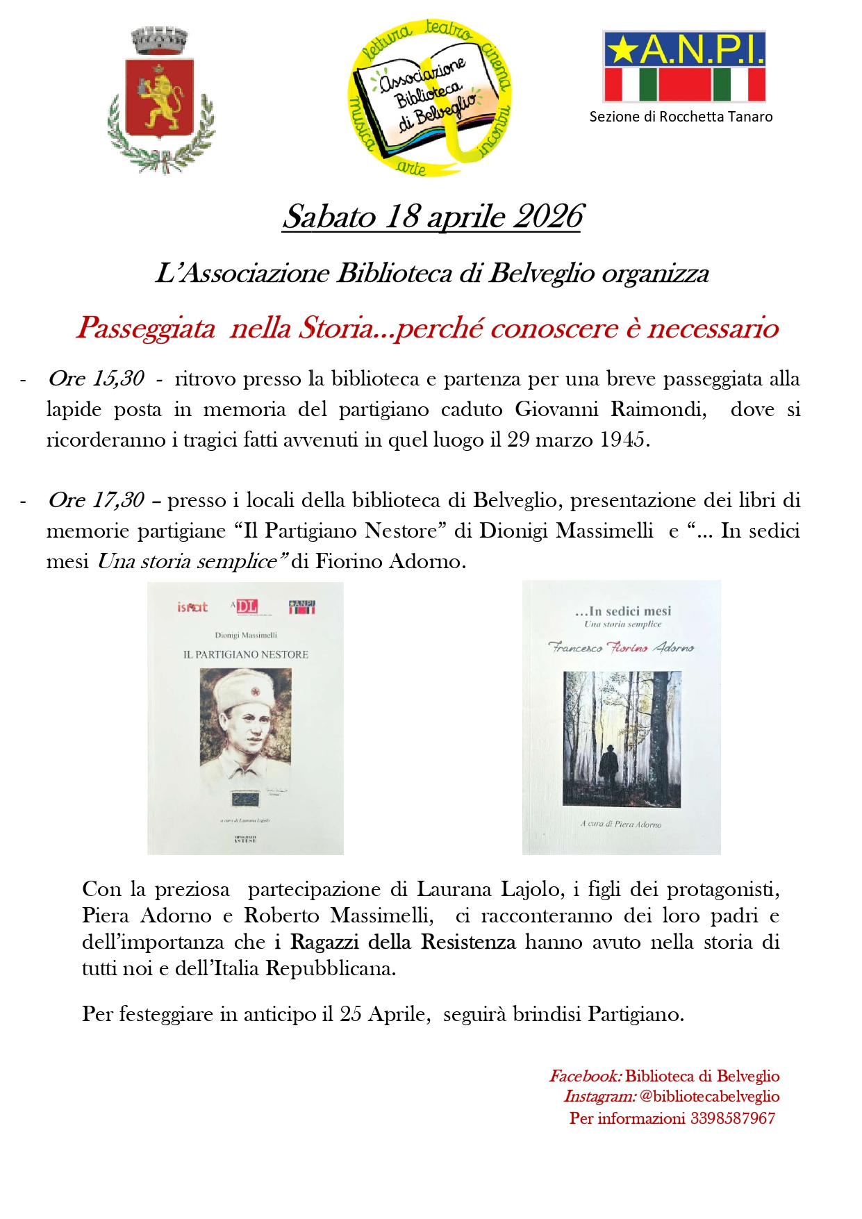 Ore 17,30 - presso i locali della biblioteca di Belveglio, presentazione dei libri di memorie partigiane "Il Partigiano Nestore" di Dionigi Massimelli e "...In sedici mesi. Una storia semplice" di Fiorino Adorno.