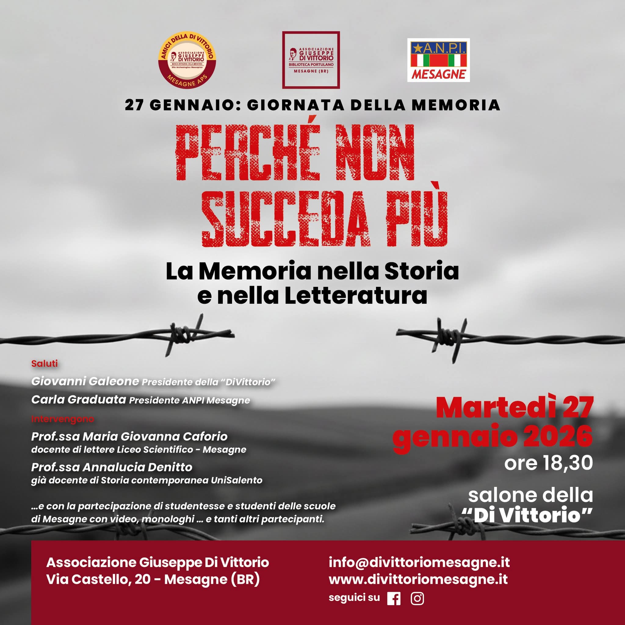 In occasione della GIORNATA DELLA MEMORIA, l'associazione "G. Di Vittorio e la sezione ANPI "E. Santacesaria" di Mesagne organizzano per Martedì 27 gennaio alle ore 18,30, nel Salone in Via Castello, 20 a Mesagne una serata di tra memoria, Storia, Letteratura e impegno civile.