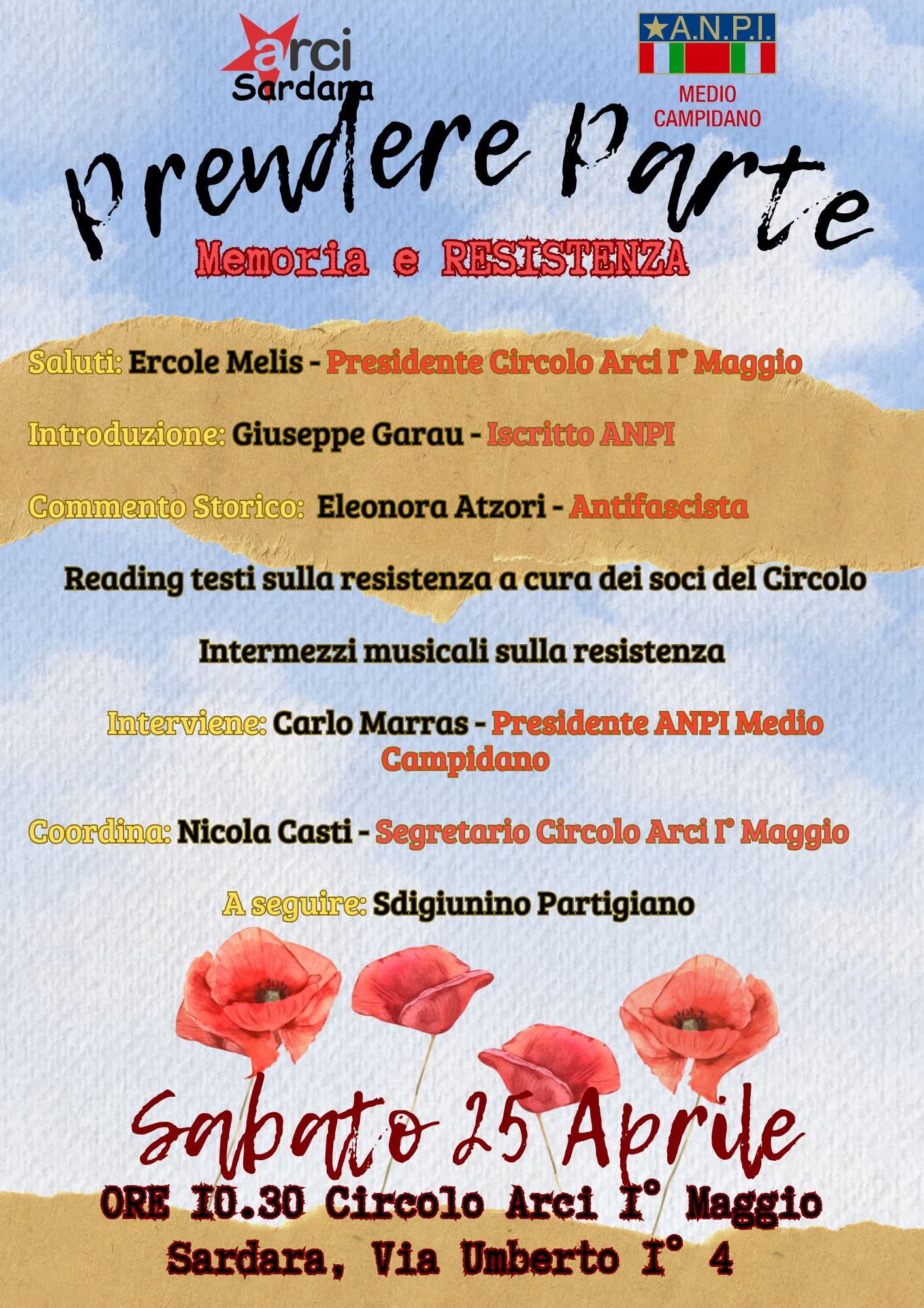 Iniziativa dal titolo “Prendere Parte - Memoria e Resistenza” a cura di ARCI e ANPI, coordina Nicola Casti (Segretario ARCI Sardara), introduzione Giuseppe Garau (iscritto ANPI), commento storico a cura di Eleonora Atzori (storica e Antifascista). Reading testi sulla Resistenza a cura dei soci del Circolo. Intermezzi musicali sulla Resistenza.