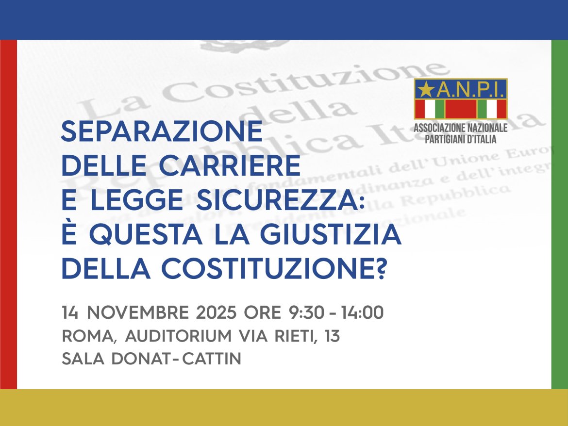 Il 14 novembre si svolgerà all'Auditorium di Via Rieti 13 a Roma - a partire dalle ore 9.30 - un convegno nazionale, promosso dall'ANPI nazionale, su 2 recenti vicende politico-parlamentari riguardanti la giustizia: la separazione delle carriere dei magistrati, che sarà oggetto di un referendum, e la legge sicurezza. Interverranno rappresentanti di associazioni dei magistrati e degli avvocati, di ARCI, ACLI e CGIL e dei partiti.