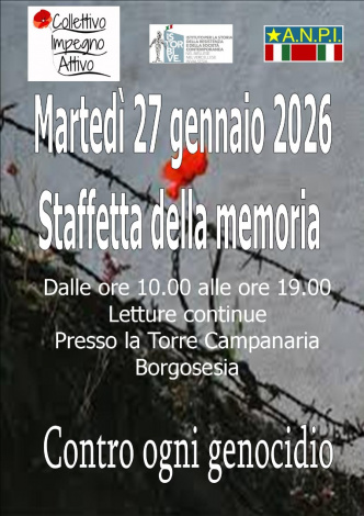 a Borgosesia (presso la Torre campanaria), dalle 10 alle 19, si svolgerà la Staffetta della Memoria. Circa settanta persone si alterneranno senza interruzione nella lettura dei nomi dei deportati vercellesi, biellesi e valsesiani nei Lager nazisti e di testimonianze e brani sui temi della Shoah e della deportazione.